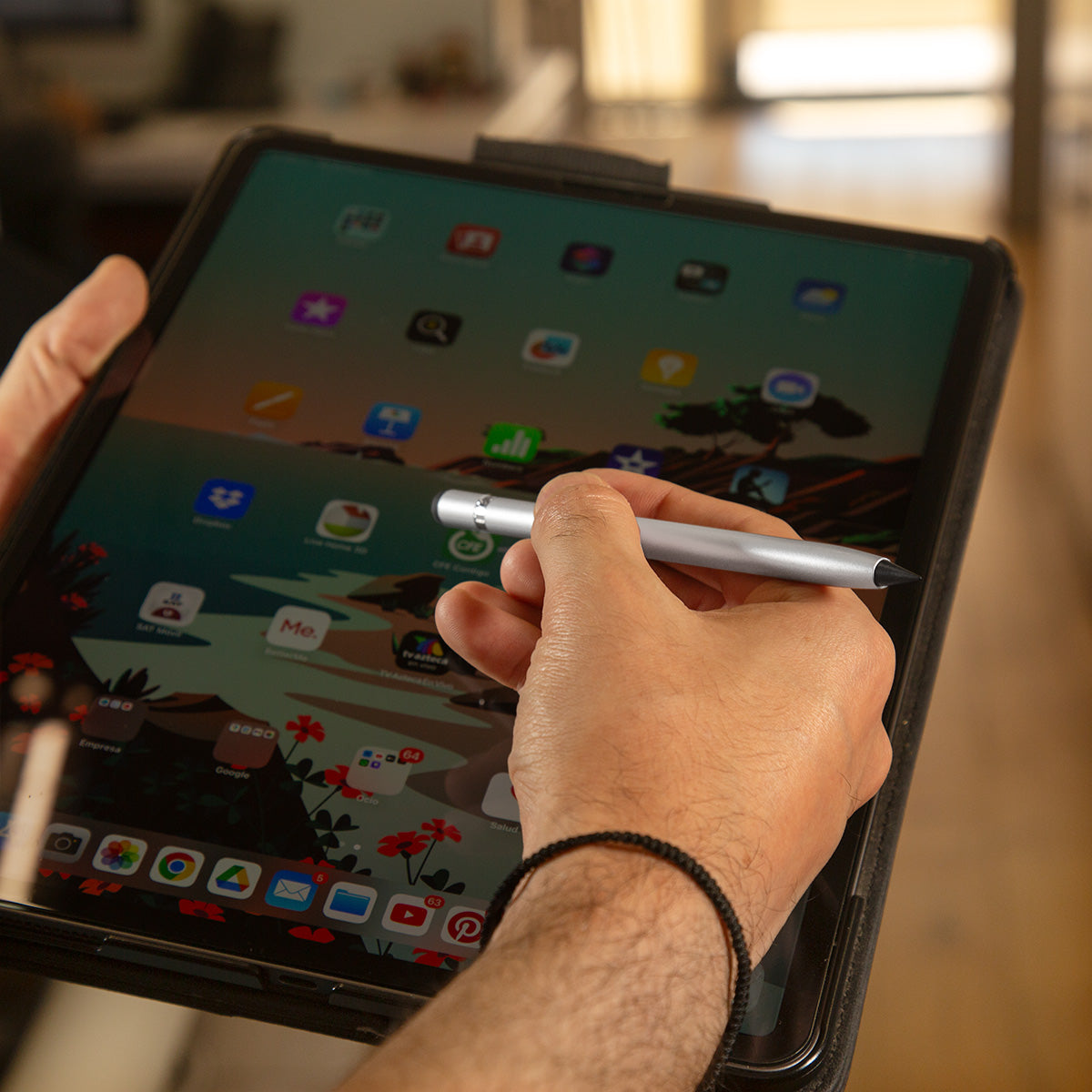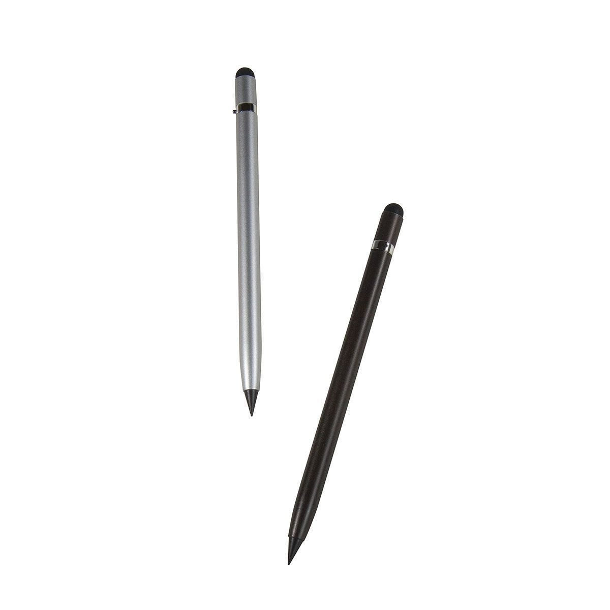 lápiz infinito con recubrimiento metalizado y tapón de plástico. incluye touchscreen y parte superior desprendible con borrador en su interior.