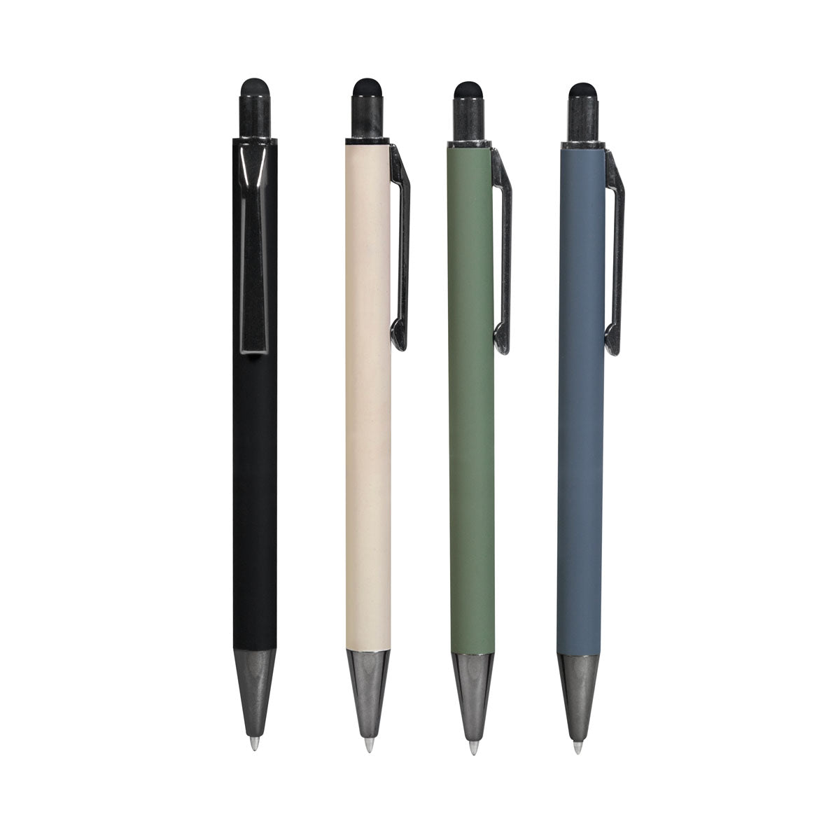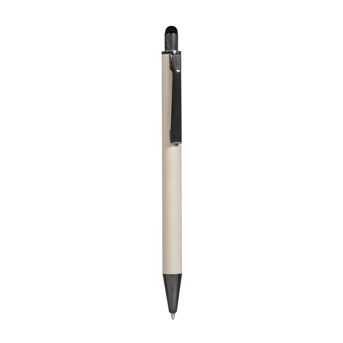 bolígrafo con terminado tipo rubber y touch screen. mecanismo pulsador. clip y punta en color metalizado oscuro.