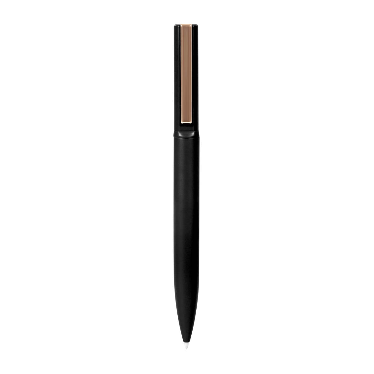 bolígrafo metálico con terminado mate y clip rose gold. mecanismo twist. incluye estuche.