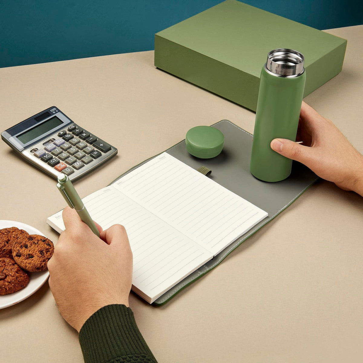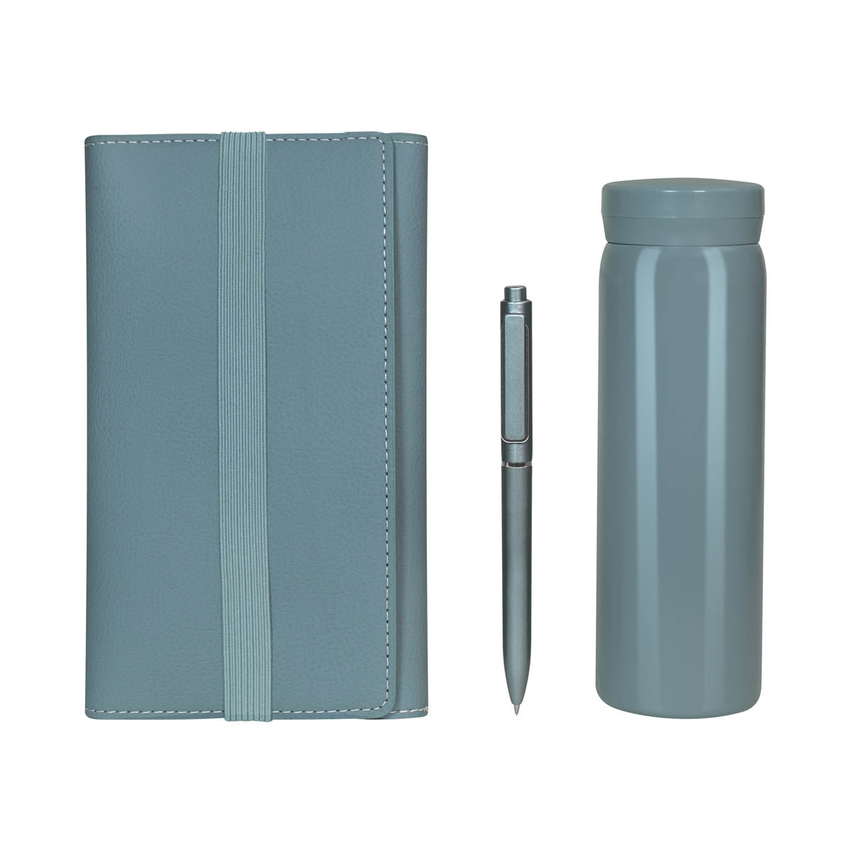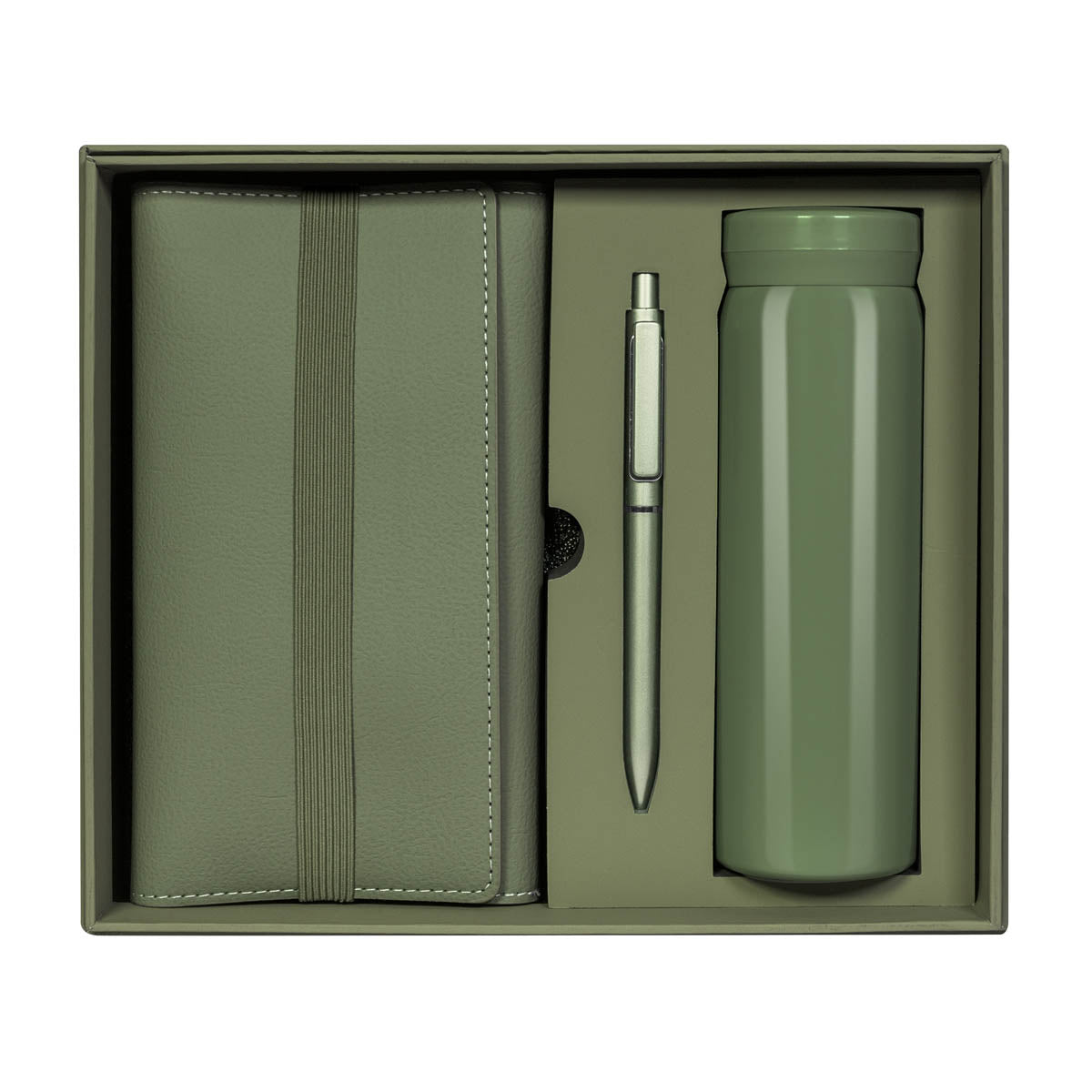set de regalo. incluye: termo de doble pared metálica con tapa de plástico con sistema de rosca, bolígrafo de plástico con sistema push, libreta con pasta de curpiel suave con cierre de elástico y 70 hojas a rayas, al interior de la libreta incluye dos bloques de notas adhesivas y 5 banderines, además de agregar compartimentos para tarjetas o pequeños documentos. presentado con atención al detalle en un empaque de calidad y mucho color, este set es el regalo perfecto para cualquier ocasión especial.