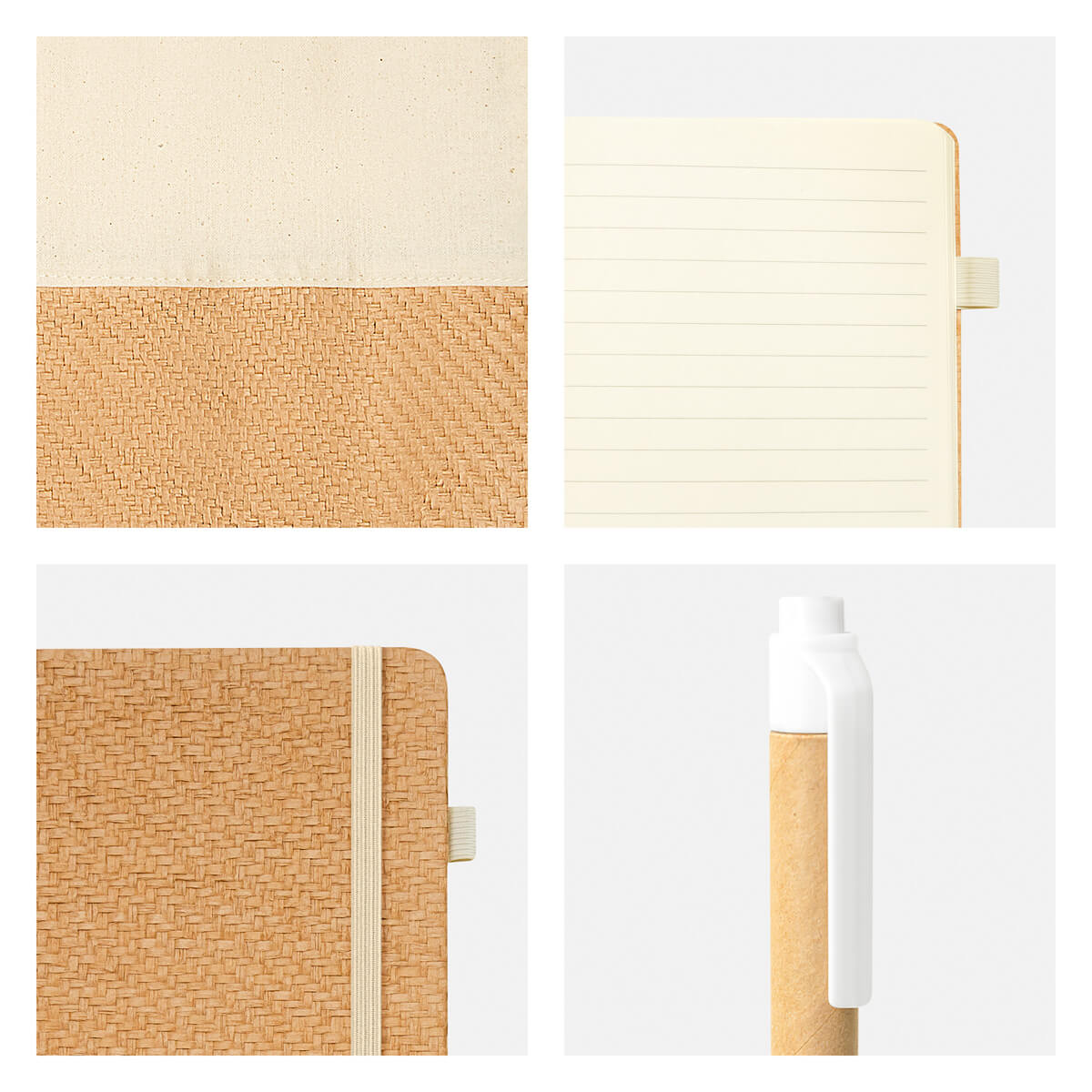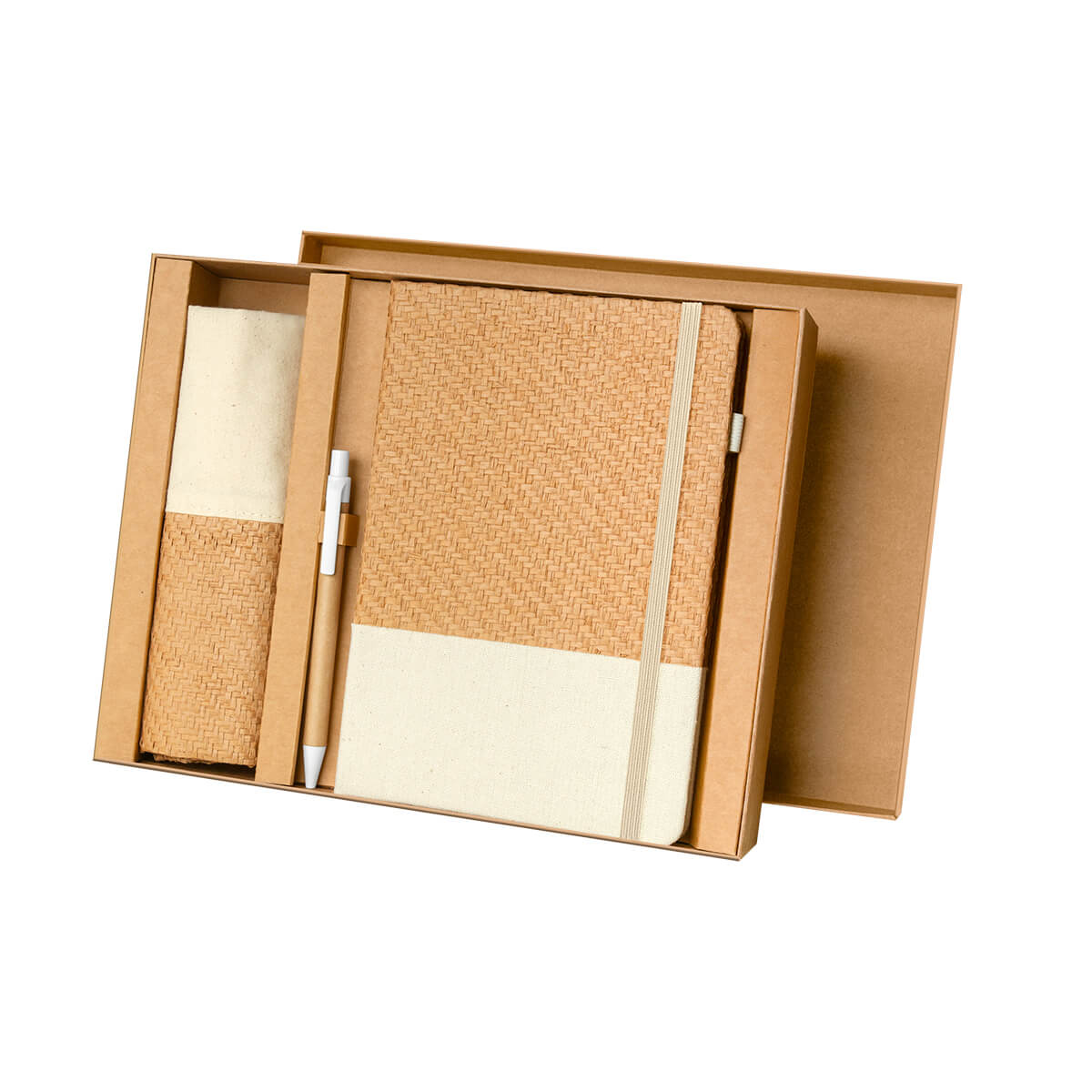 set ecológico fabricado con materiales amigables con el medio ambiente. incluye libreta con cubierta rígida, 80 hojas a rayas, elástico para cerrar y elástico porta bolígrafo. bolsa de algodón estilo tote. bolígrafo de cartón con sistema push. presentado en caja de cartón tipo regalo.