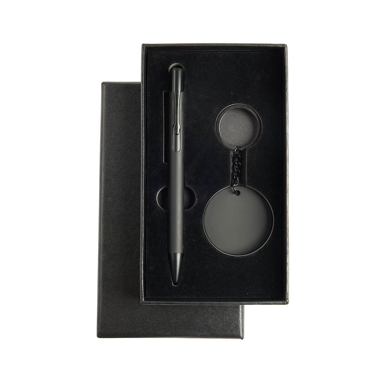 set de regalo de 2 piezas. contiene bolígrafo metálico con terminado rubber y mecanismo pulsador, además de un llavero metálico con terminado suave al tacto, que al grabarlo con láser, revela un efecto espejo que lo hace único y distintivo. incluye caja de regalo.