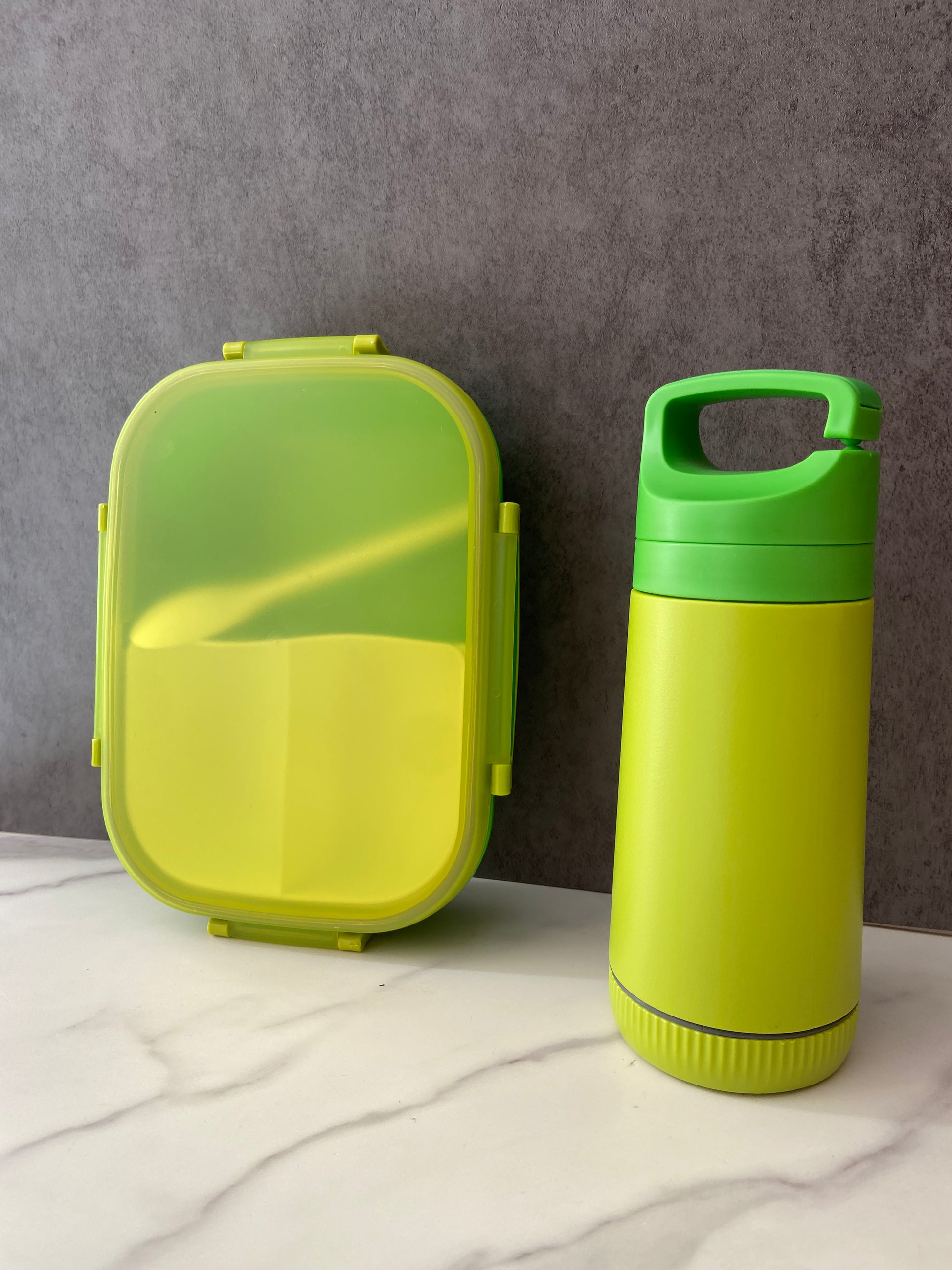 set para almuerzo libre de bpa fabricado en polipropileno (pp). incluye botella con capacidad de 350 ml y contenedor para alimentos con tres compartimentos, cuchara y broche de seguridad para garantizar que tu comida se mantenga fresca y segura en todo momento.