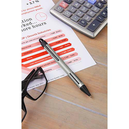bolígrafo con touch screen y grip antiderrapante. mecanismo pulsador. incluye funda.