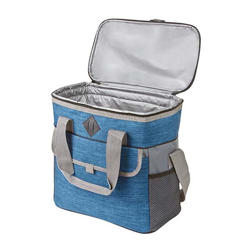 interior plastificado impermeable. bolsa principal con cierre, bolsa frontal con velcro. 2 bolsas laterales de red y 2 asas superiores para agarre. capacidad para 12 latas.