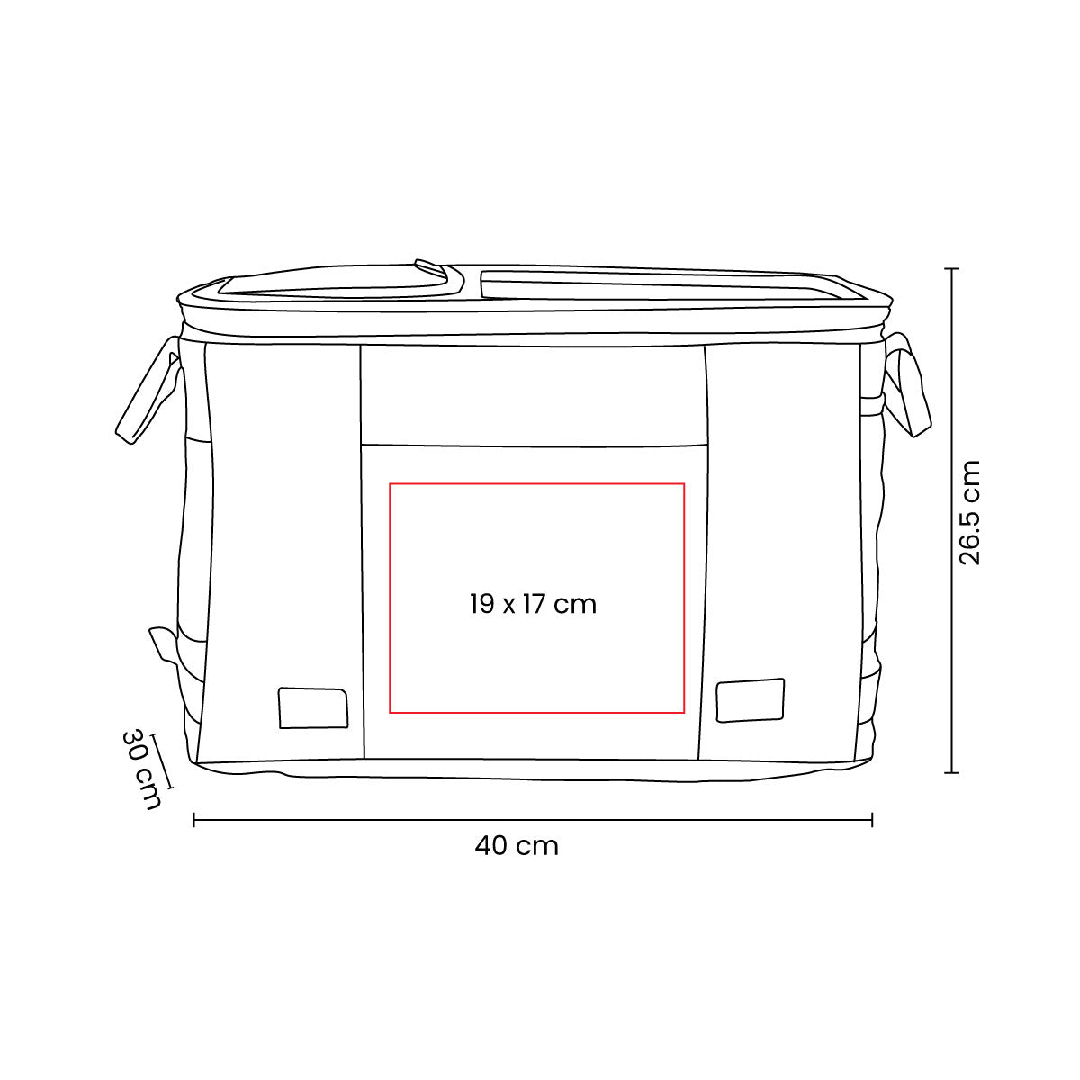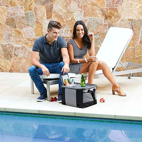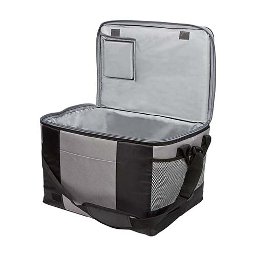 hielera plegable con interior plastificado impermeable, cubierta de plástico con ventana para fácil acceso a interior, bolsas laterales de red y correa ajustable. capacidad para 36 latas.