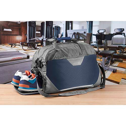 bolsa principal con cierre, bolsa frontal. compartimento lateral para zapatos y bolsa lateral. incluye correa para hombro ajustable con broches de plástico y asas superiores.