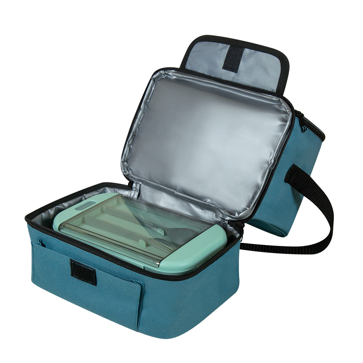 lonchera con amplio compartimento principal de apertura frontal y práctico compartimento secundario en la parte inferior, perfecto para guardar snacks adicionales. el plastificado interior garantiza higiene y facilidad de limpieza. incluye una bolsa frontal con velcro especialmente diseñada para guardar cubiertos, evitando que se mezclen con las demás pertenencias. sus asas de mano y de hombro, ofrecen versatilidad para llevarla contigo. capacidad para 12 latas.