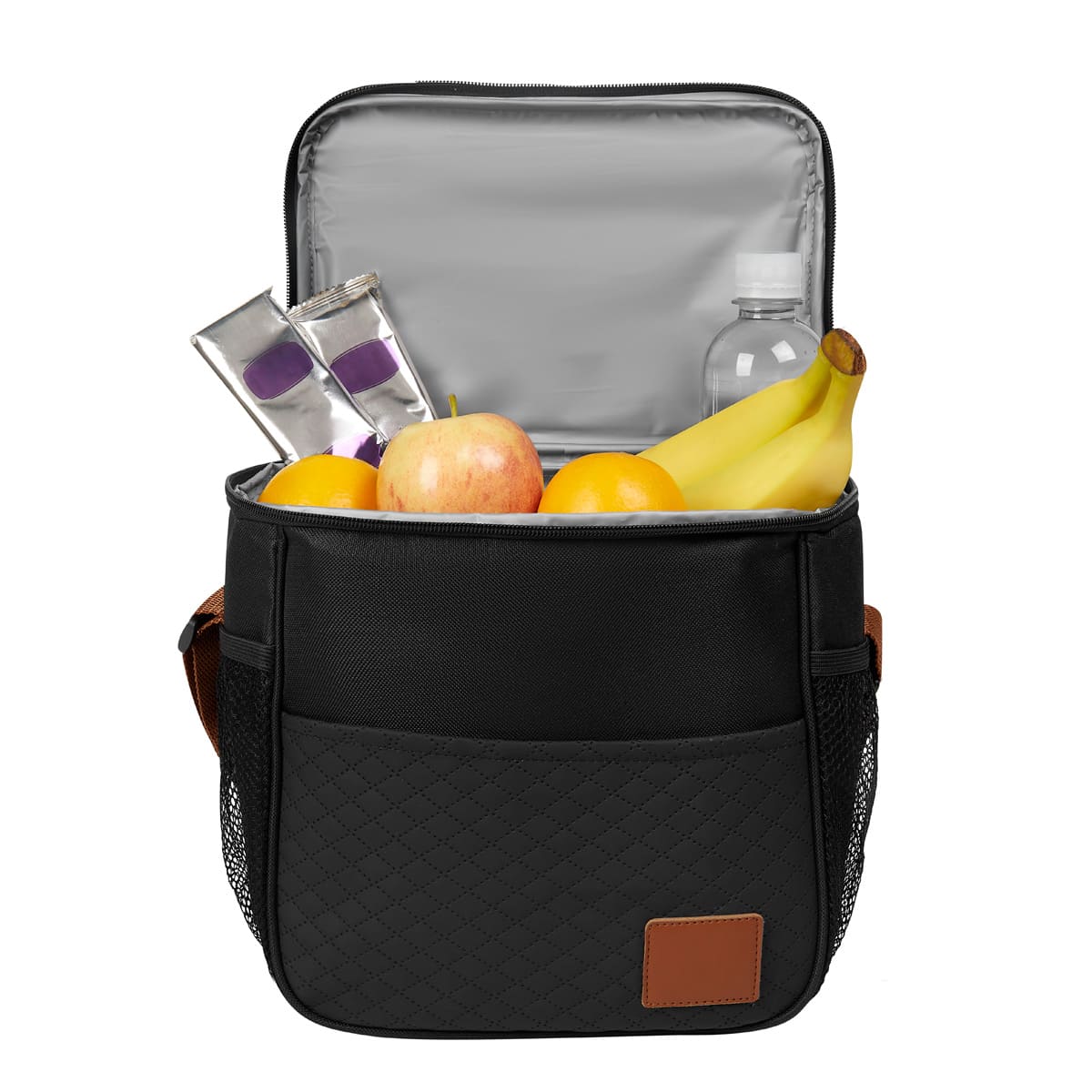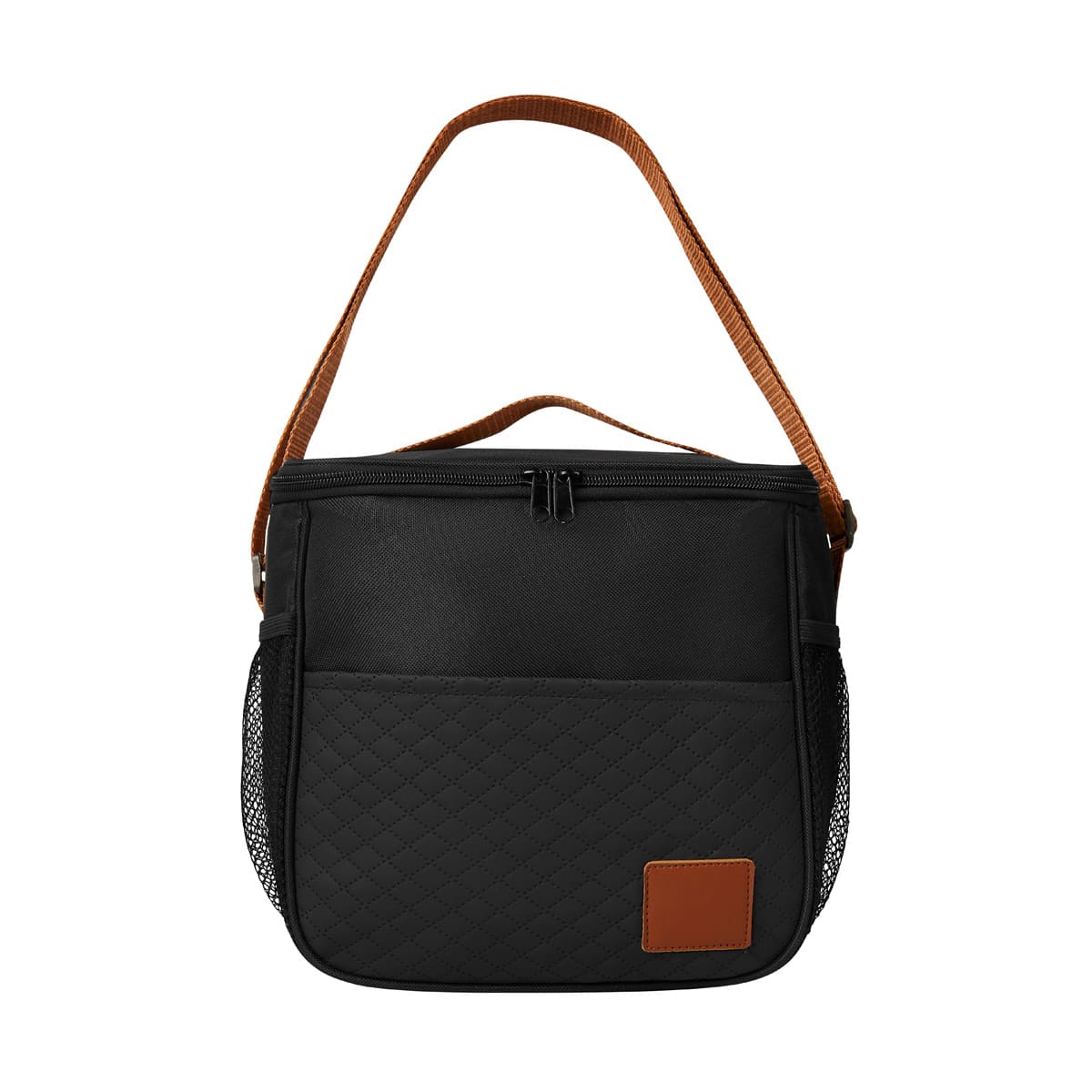 lonchera con interior plastificado, bolsa principal con cierre, 2 bolsillos laterales de red y bolsa frontal con diseño capitonado y con parche de curpiel. para mayor comodidad cuenta con asa de transporte superior y correa ajustable para hombro. capacidad para 9 latas.