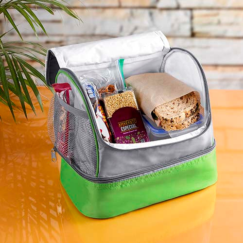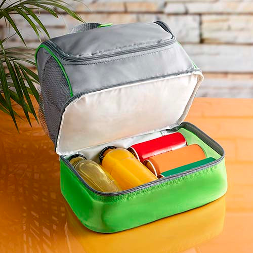 interior plastificado. doble compartimento con cierre. bolsa lateral de red y asa de agarre superior. capacidad para 9 latas.