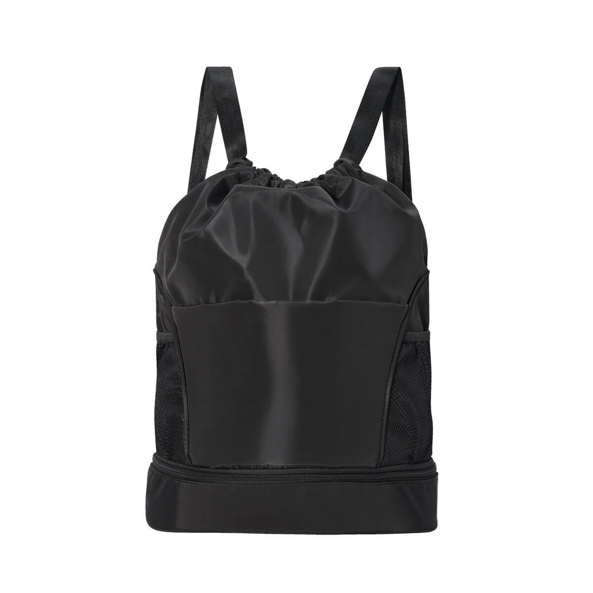 bolsa con cierre de jareta. compartimento principal con separador a prueba de agua y bolsillo con cierre. bolsillo frontal con cierre y dos mallas laterales. en la base compartimento con cierre para zapatos o accesorios. incluye asas ajustables con broche metálico.