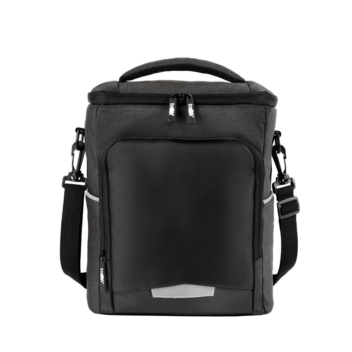 hielera con interior plastificado y sellado. bolsillo frontal con cierre, incluye asa superior acolchada y correa ajustable con broche removible. capacidad para 12 latas.