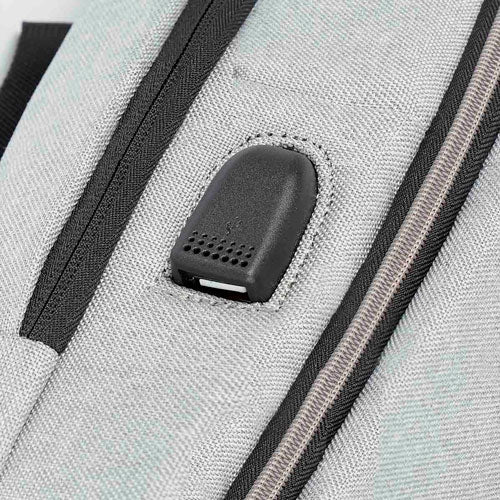 mochila con salida usb (se requiere conectar a batería portátil) para cargar smartphone. bolsa principal con organizador y compartimento interno para laptop de 14" y tablet. 2 bolsas frontales con cierre, una con cierre interno para fácil bordado. aditamento especial trasero para poner en trolley. tirantes acojinados.