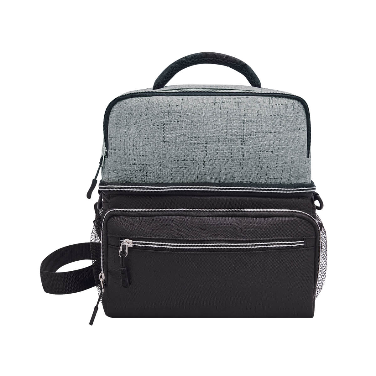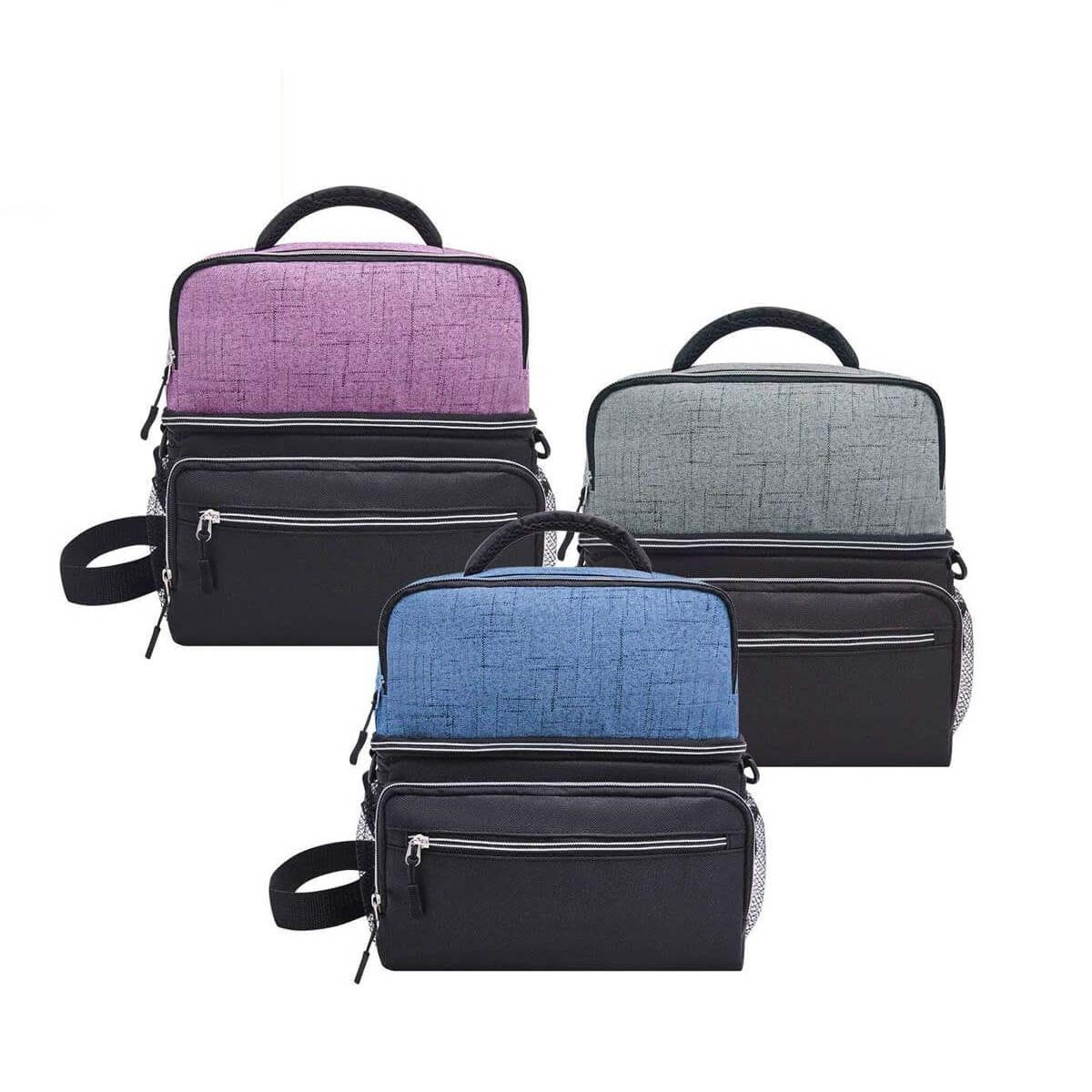 interior plastificado impermeable. bolsa principal con cierre, 2 bolsillos frontales con cierre, bolsa frontal superior con cierre, 2 bolsas laterales de red. incluye correa ajustable. capacidad de 12 latas.