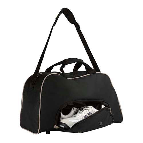 bolsa principal con cierre, zapatera posterior con cierre, bolsa lateral de red, asas y correa para hombro ajustable.