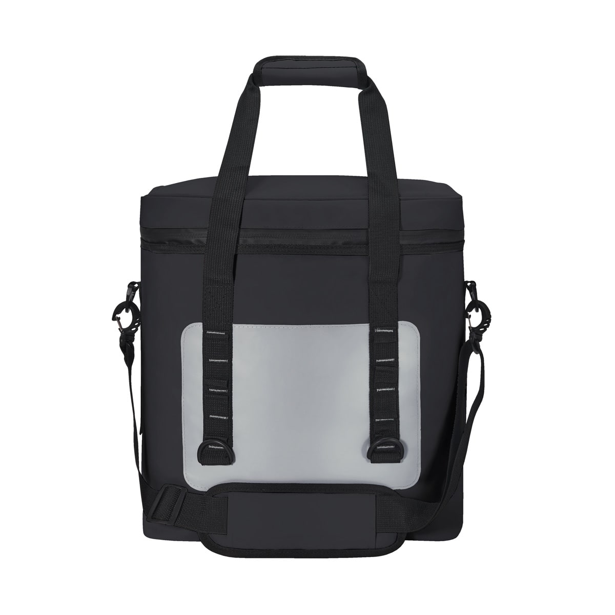 interior y exterior plastificado impermeable. bolsa principal con cierre, bolsillo frontal. incluye asa de mano con velcro y correa larga ajustable con soporte acojinado. capacidad para 36 latas.