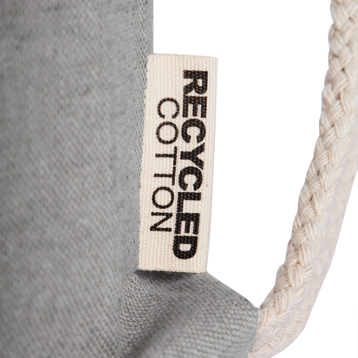 bolsa-mochila gris ecológica de algodón reciclado con tirantes de cordón y cerrado de jareta. cuenta con una bolsa frontal y asas para usar como bolsa.
