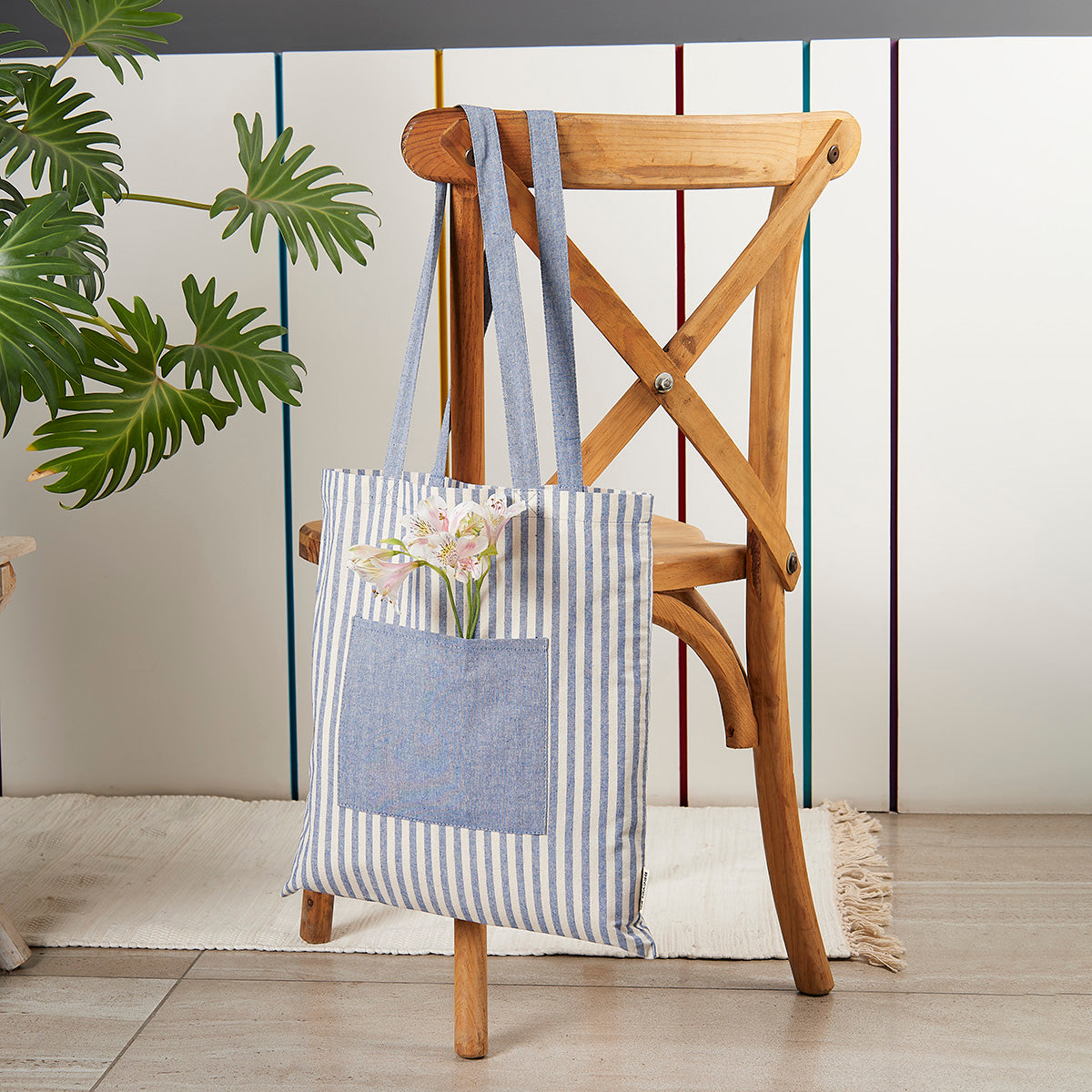 bolsa ecológica de algodón reciclado. sin fuelle. incluye bolsillo frontal. estampado de rayas.