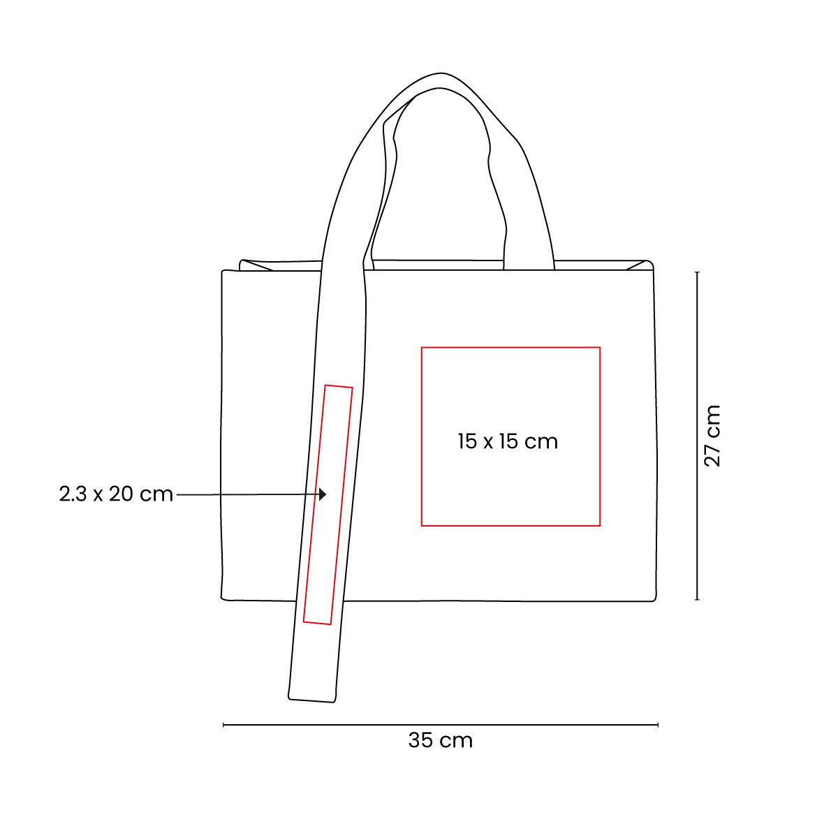 área de impresión: 15 x 15 cm bolsa / 2.3 x 20 cm correa
