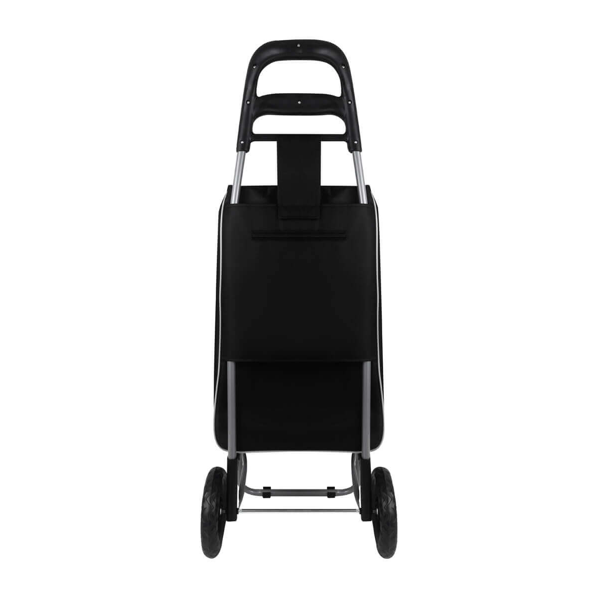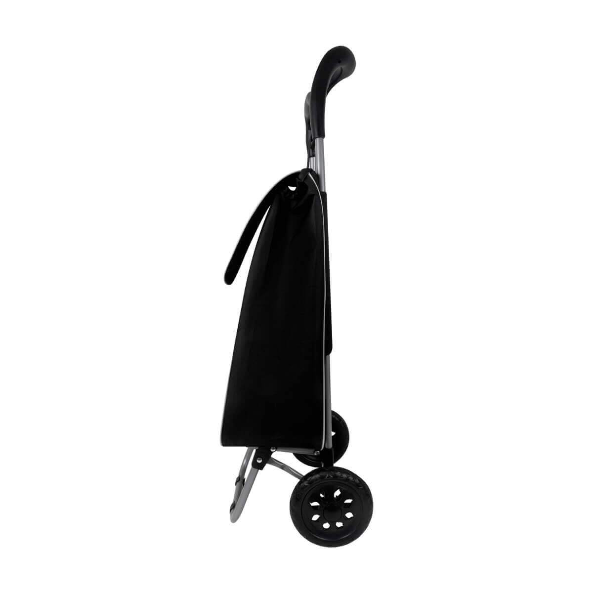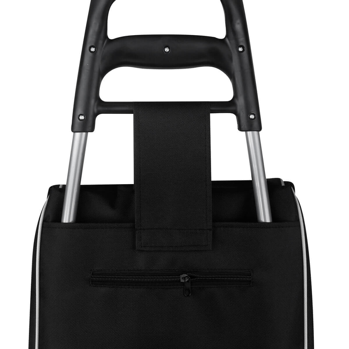 bolsa para supermercado con jareta y solapa. incluye bolsa posterior con cierre, estructura de metal, base para sostenerse, agarradera y llantas de plástico. bolsa desmontable con velcro en la parte posterior. ideal para las compras de fin de semana.