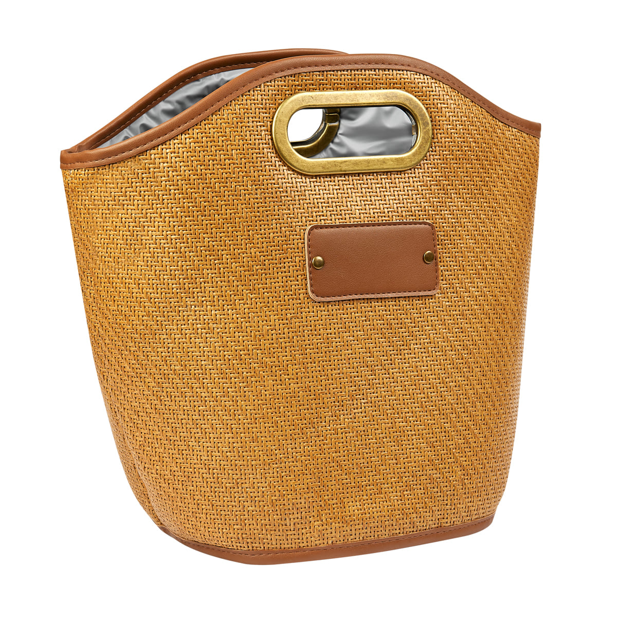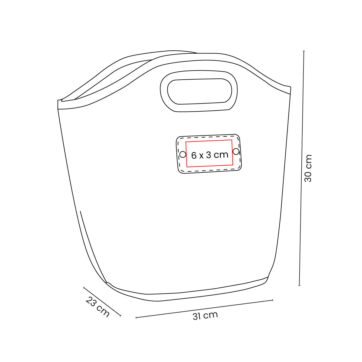 hielera tipo bolsa con interior sellado plastificado. compartimento principal con diseño abierto. asas con marco de metal. capacidad para 12 latas.