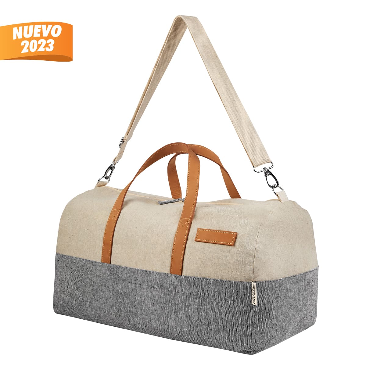 maleta que destaca tanto en diseño como en estilo. es ligera y ecológica, hecha de algodón reciclado. compartimento principal con cierre y base de cartón removible. incluye asa ajustable removible para hombro.