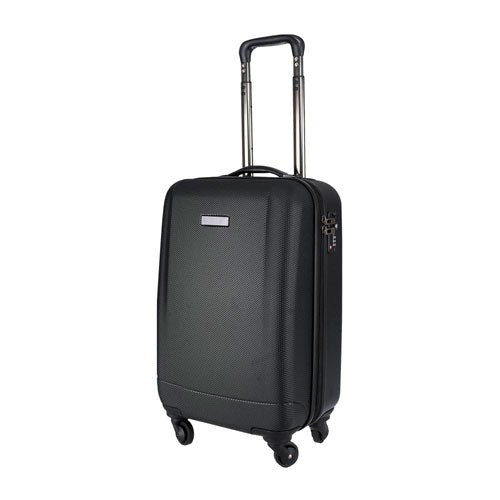 maleta trolley con 4 ruedas. incluye 4 compartimentos interiores, placa metálica removible para fácil grabado y candado de seguridad tsa con combinación de 3 dígitos. asa de agarre superior.