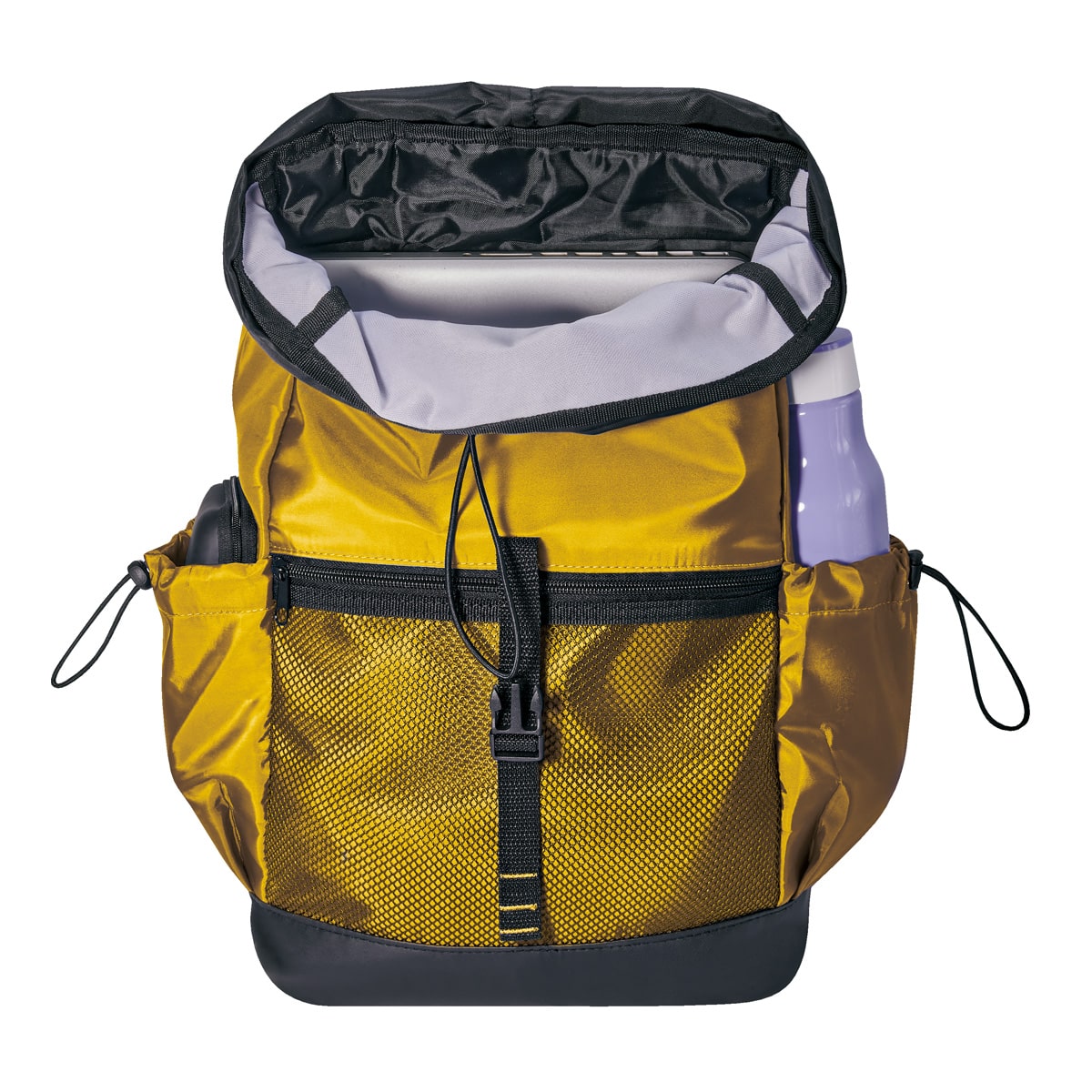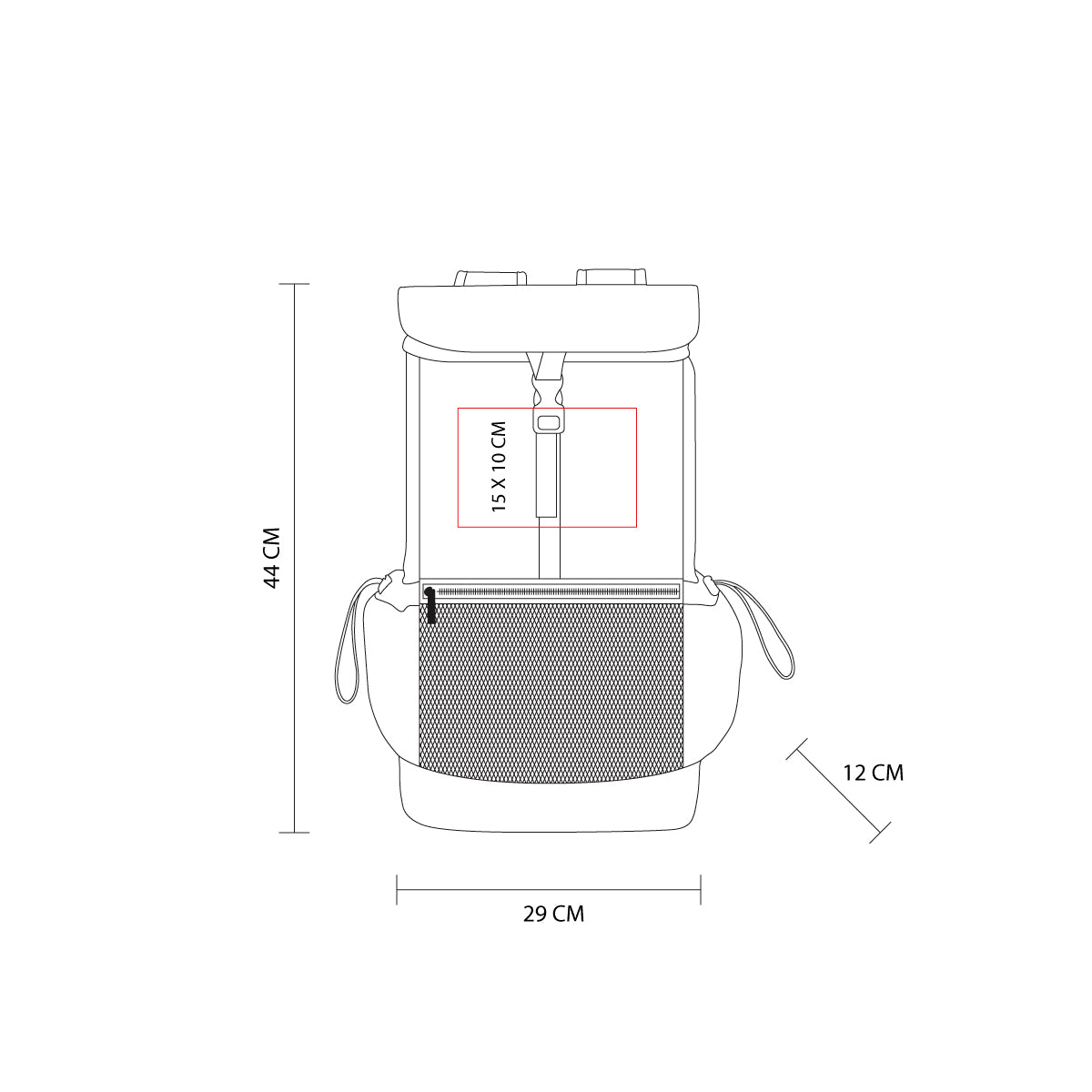 solapa frontal con gancho y correa ajustable. bolsa principal con cierre. bolsa frontal de red con cierre. compartimento para laptop de 14". bolsillos laterales con jareta. tirantes ajustables y correa de agarre superior.