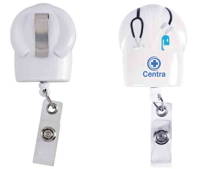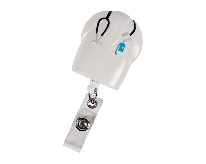 portagafete de plástico de cuerpo hueco con forma de bata de doctor, clip e hilo elástico con broche para gafete.