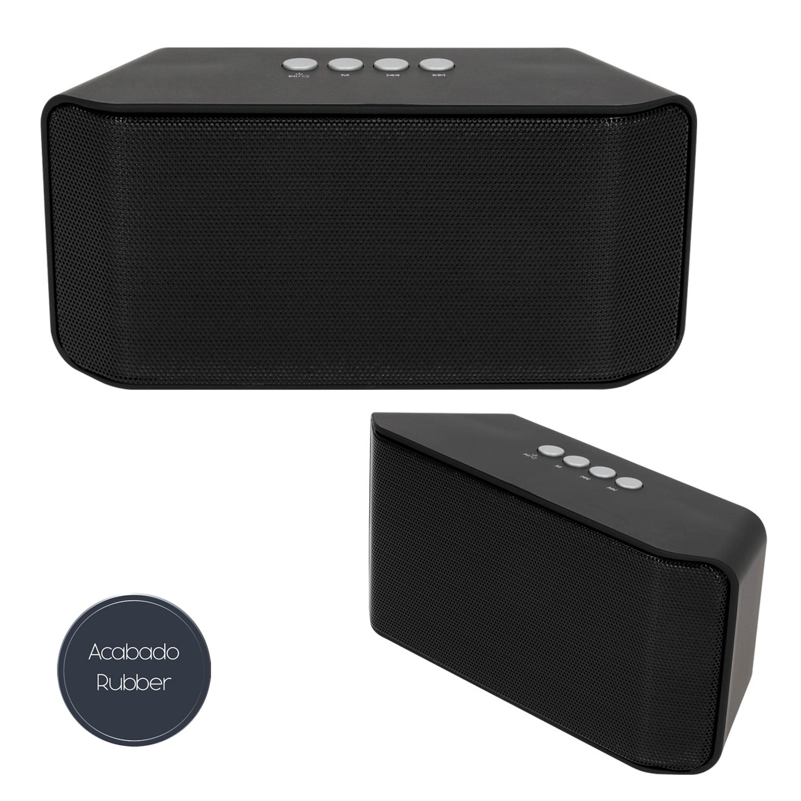 bocina portátil bluetooth en acabado rubber, micro sd, usb, auxiliar y radio. incluye cable de carga y auxiliar. batería recargable con duración de 4 hrs.