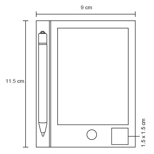 mini pizarrón digital de plástico, con plumilla, botón para eliminar escritura, botón de bloqueo para evitar la pérdida de información e imán en la parte trasera. incluye una batería.
