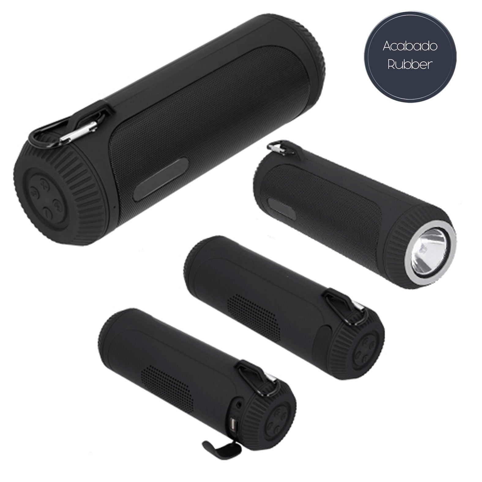 bocina portátil bluetooth de plástico en acabado rubber con placa metálica, radio fm, botón de encendido y apagado, control de volumen, función de manos libres, lámpara de luz led, asa, arnés de metal, cable aux., cable para carga micro usb, entrada tarjeta de memoria micro sd y usb con compartimento que protege los puertos del polvo. con duración de 2-4 horas.