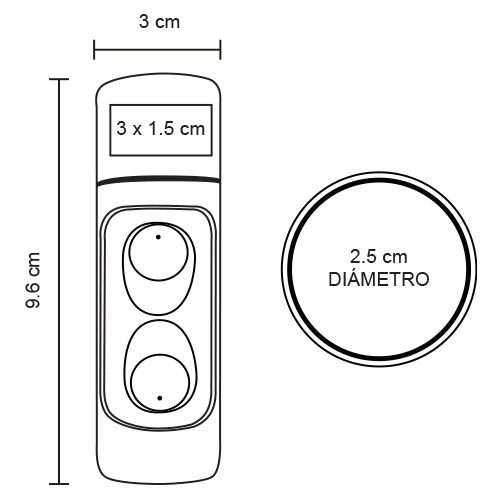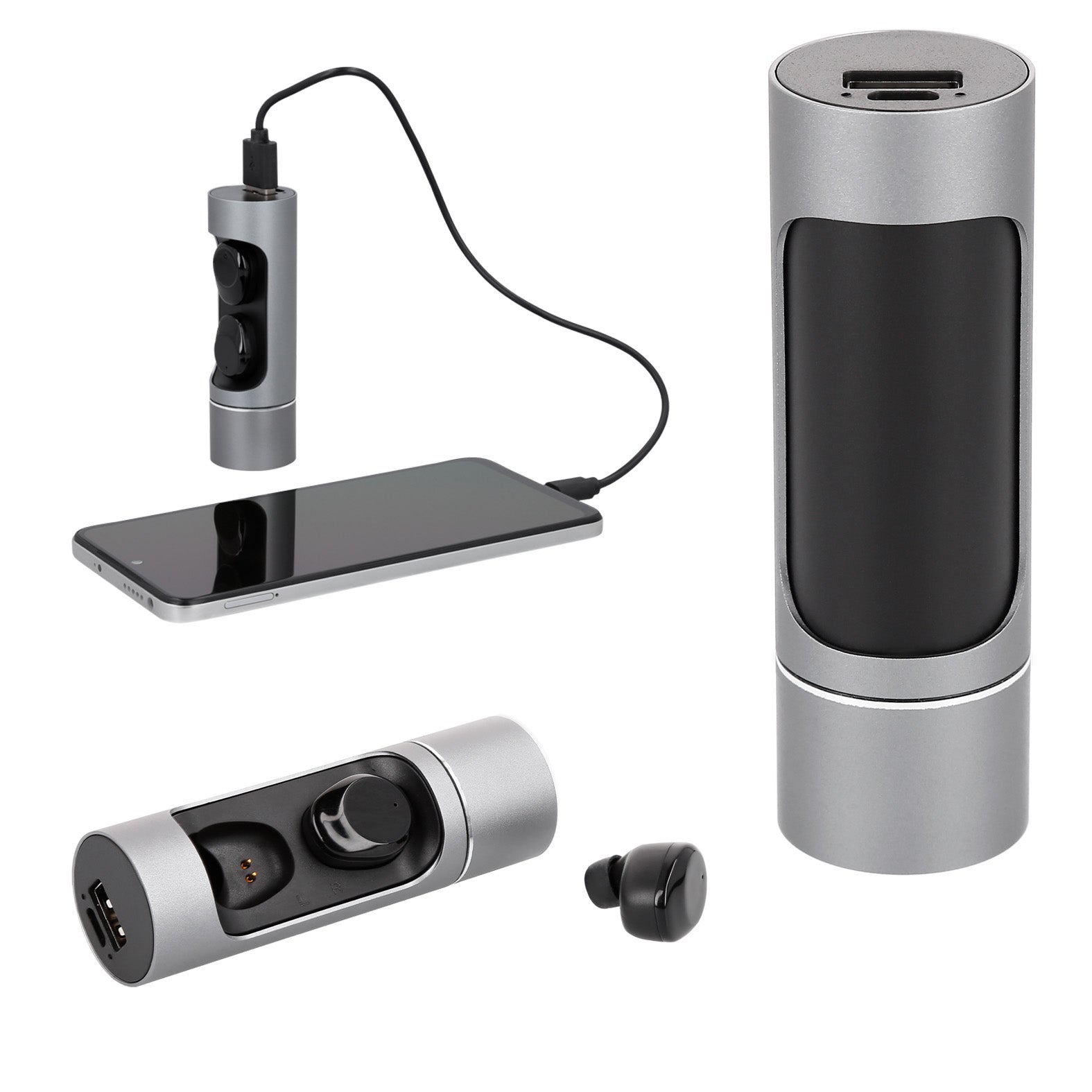 audífonos bluetooth con botón de encendido/apagado y mecanismo touch. incluye estuche de aluminio recargable con power bank integrada, gomas de repuesto y cable de carga.