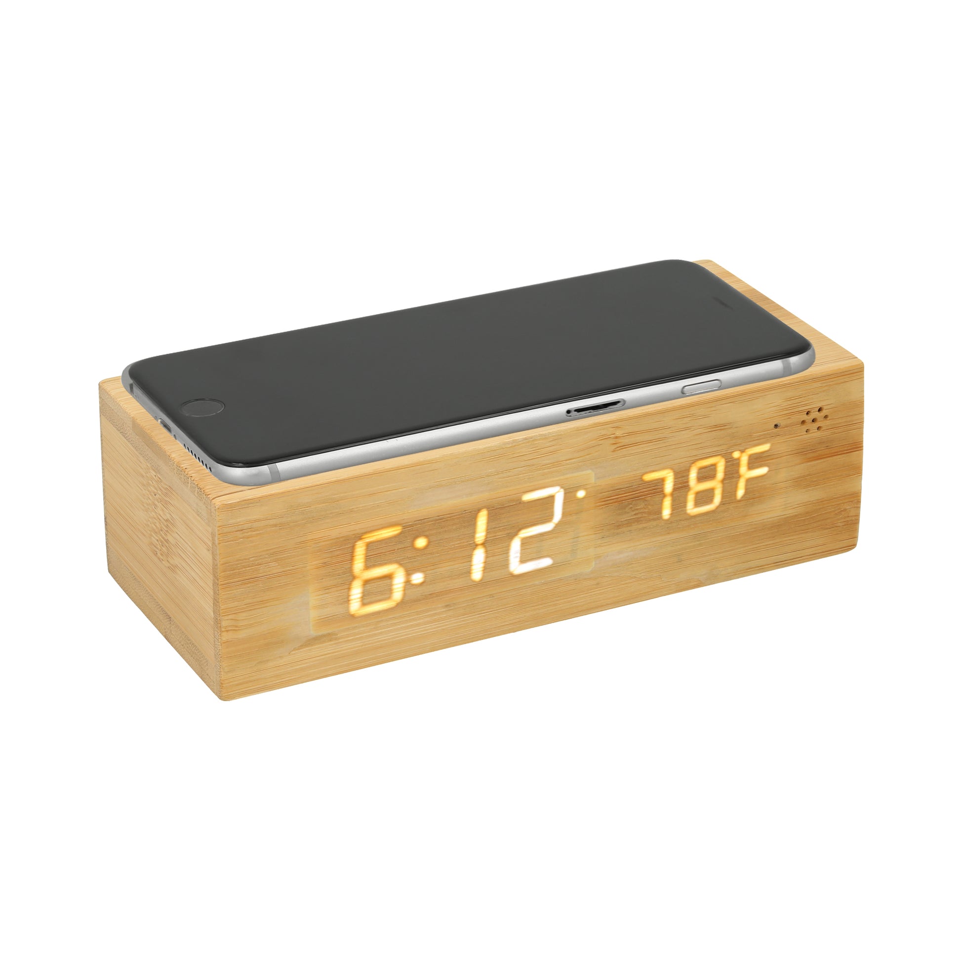 reloj digital de bambú con wireless y medidor de temperatura ambiental. incluye cargador.
