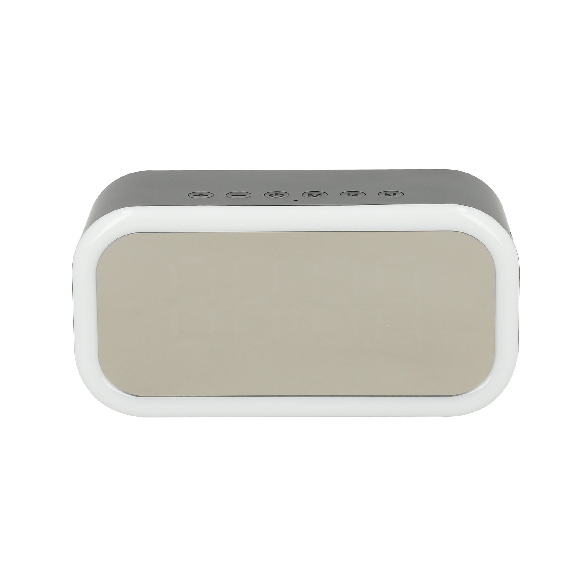 bocina bluetooth portátil con reloj digital, radio fm y micrófono para contestador de llamadas, cuenta con entrada para aux, tf y cable de carga.
