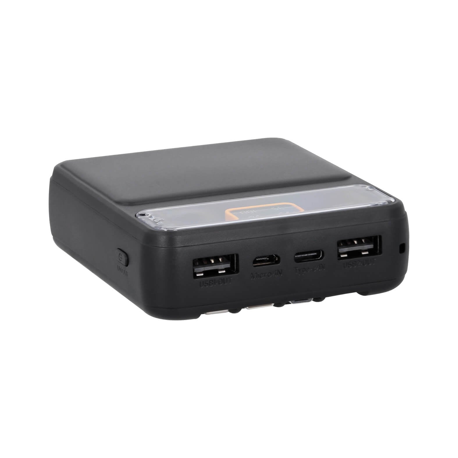 power bank de 8,000 mah con carga rápida, cables para dispositivos de entrada usb, micro usb, tipo c y lightning, además de 2 puertos usb, 1 micro y 1 tipo c. incluye indicador de carga y botón de encendido o apagado.