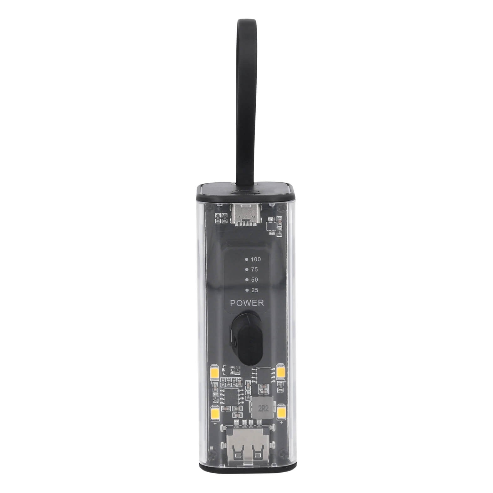 power bank transparente de 5,000 mah con salida y puerto tipo c, 1 cable lightning, 1 cable y puerto usb.