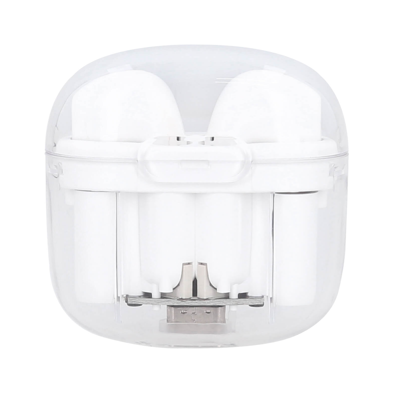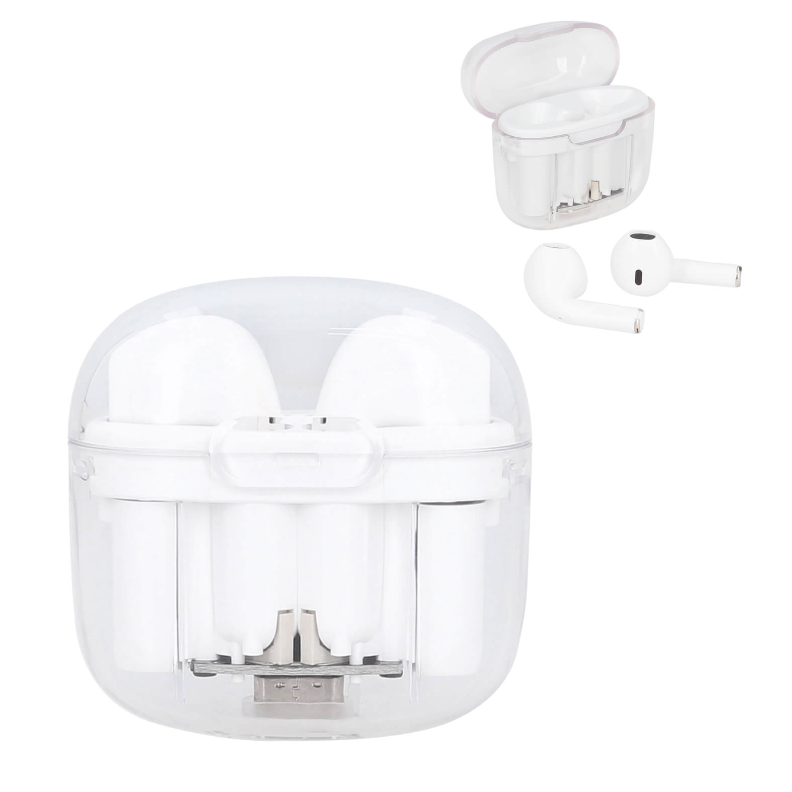 audífonos inalámbricos con estuche transparente, batería recargable y mecanismo touch. incluye cable de carga tipo c.