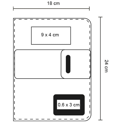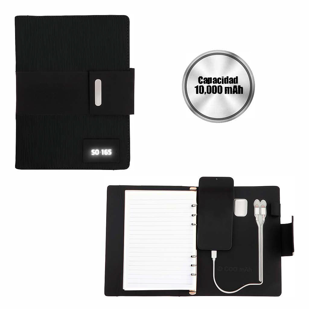 carpeta de poliéster con cierre magnético, block de 100 hojas rayadas y compartimento para tarjetas. incluye power bank de 10,000 mah con cables usb, tipo c, micro usb y lightning