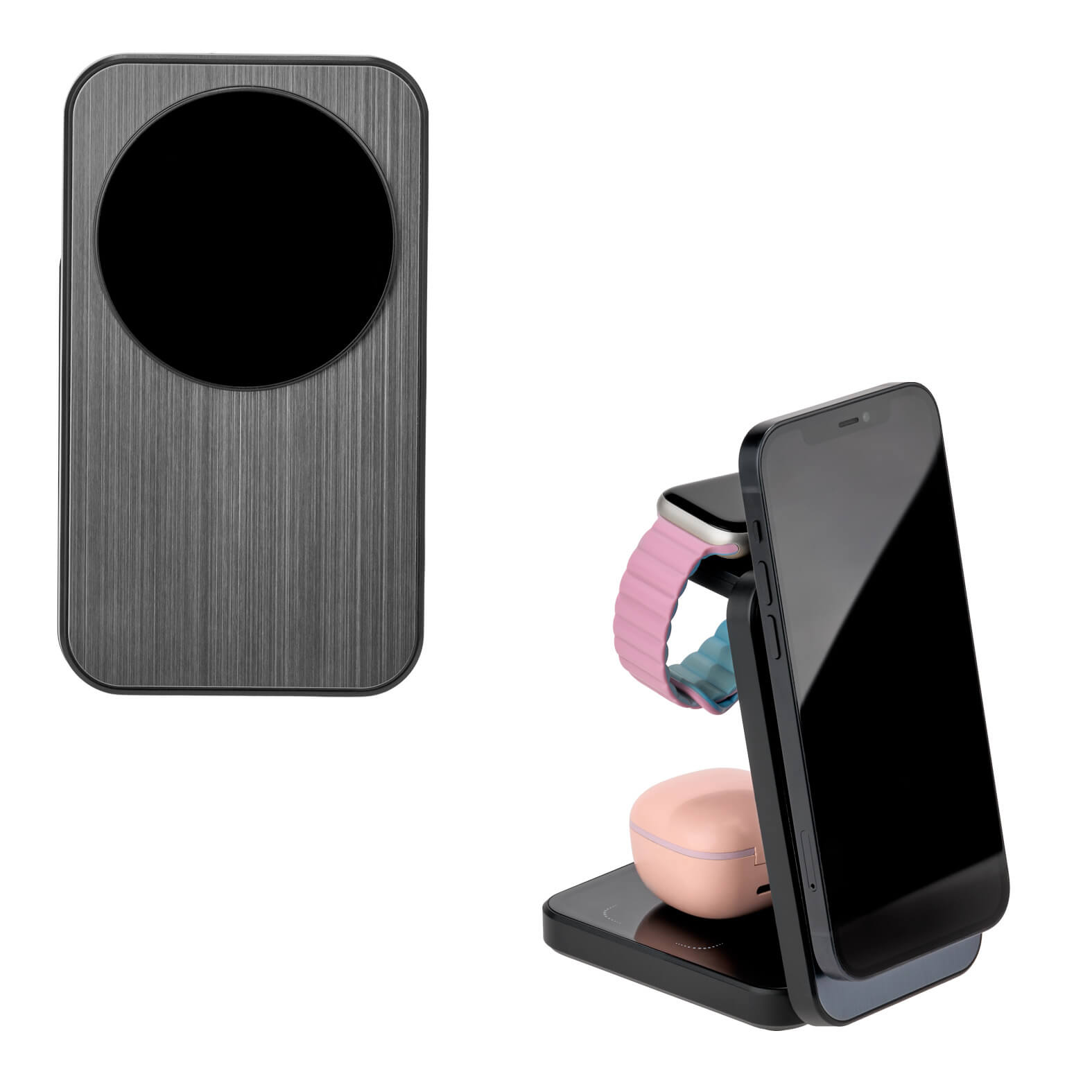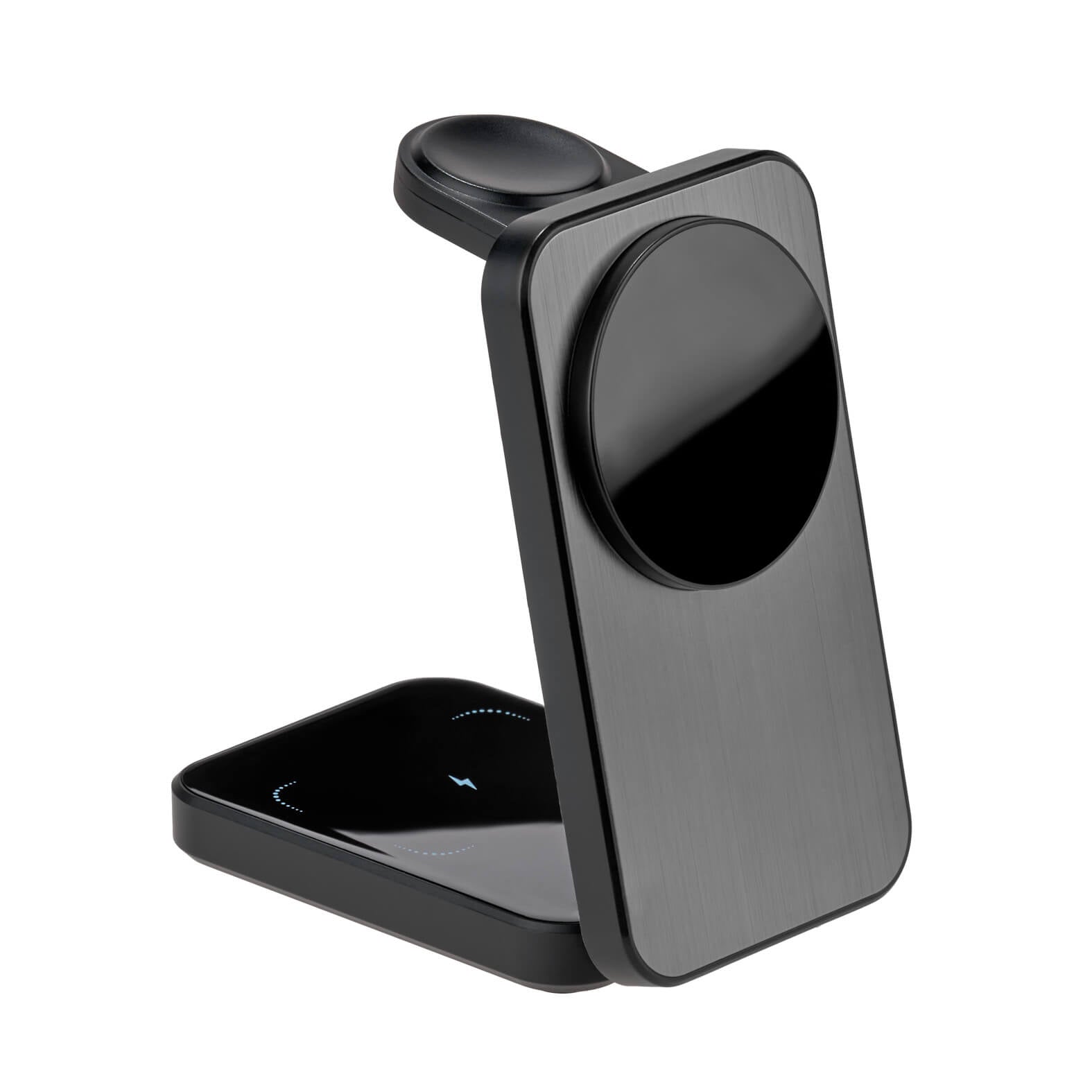 multicargador inalámbrico plegable 3 en 1 para smartphone, audífonos y reloj inteligente. cuenta con cable de carga tipo c.