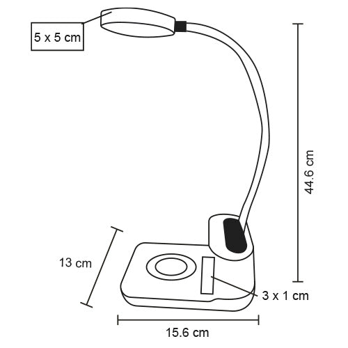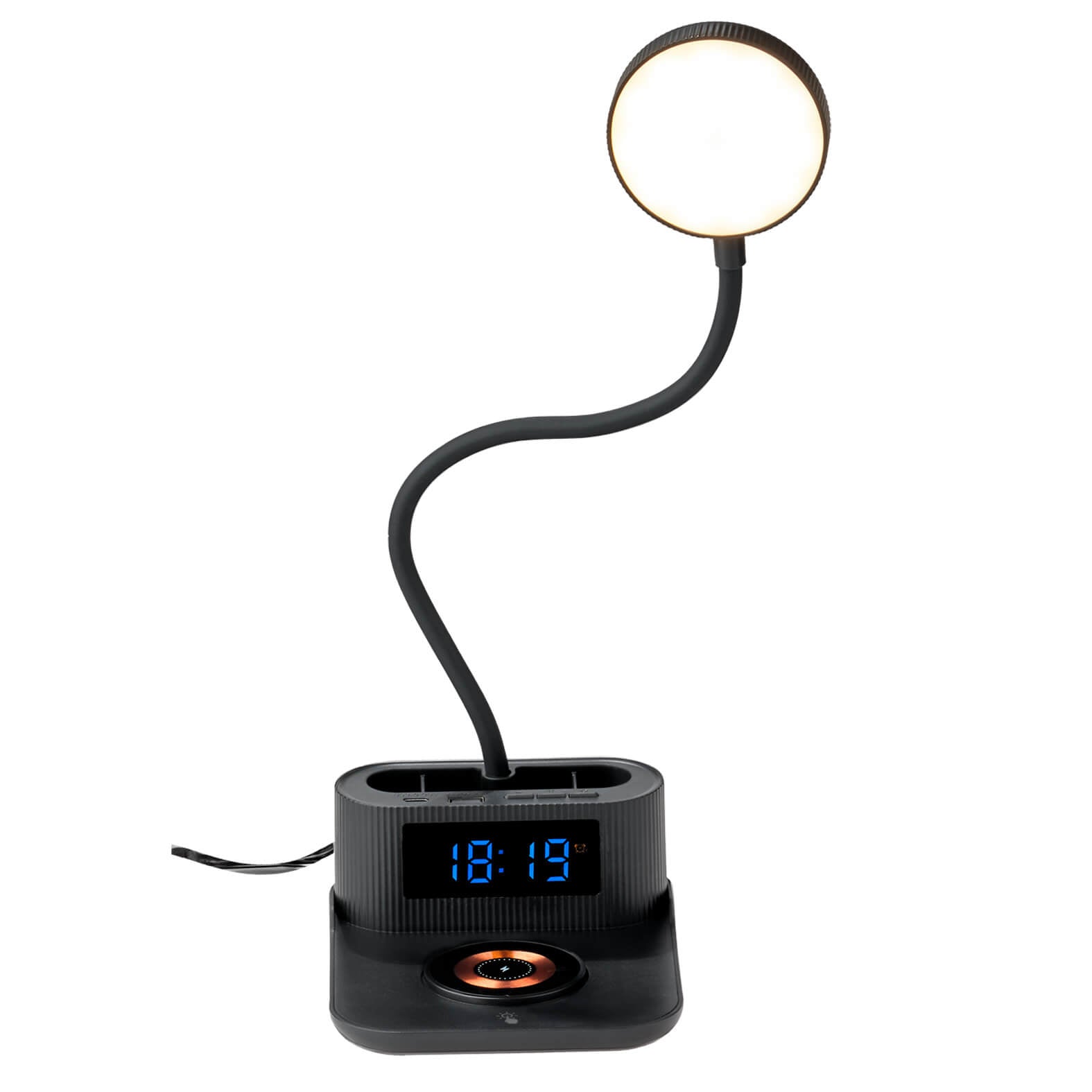 lámpara de escritorio con sensor touch de tres niveles, organizador, reloj digital, cargador inalámbrico, puerto usb y tipo c. incluye cable de carga tipo c.