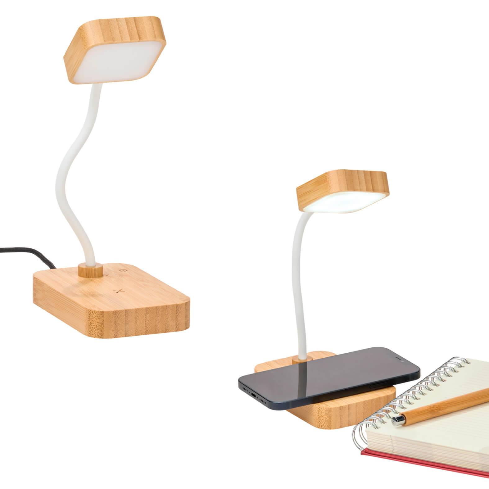 cargador inalámbrico de bambú con lámpara y botón touch con tres modalidades. incluye cable de carga tipo c.