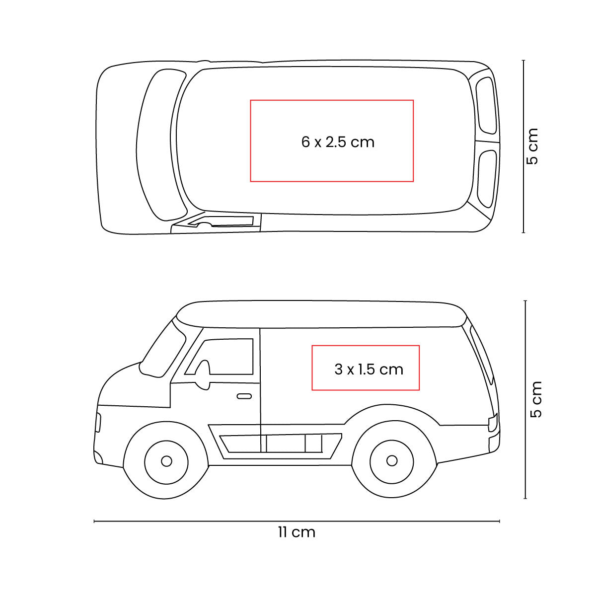 área de impresión: 2.5 x 6 cm (arriba) / 3 x 1.5 cm (lateral)