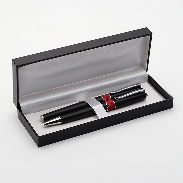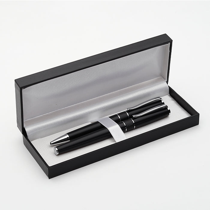set de bolígrafos ball pen y roller pen con barril metálico en estuche de cartón, tinta de escritura negra.