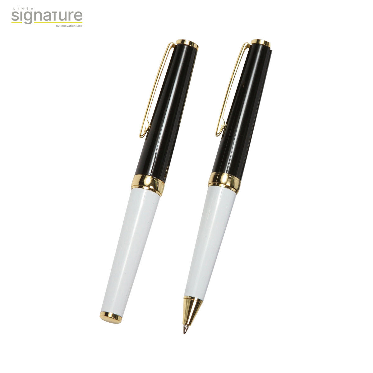 set de bolígrafos ball pen y roller pen con barril lacado, punta y clip metálicos en estuche de cartón. tinta de escritura negra.