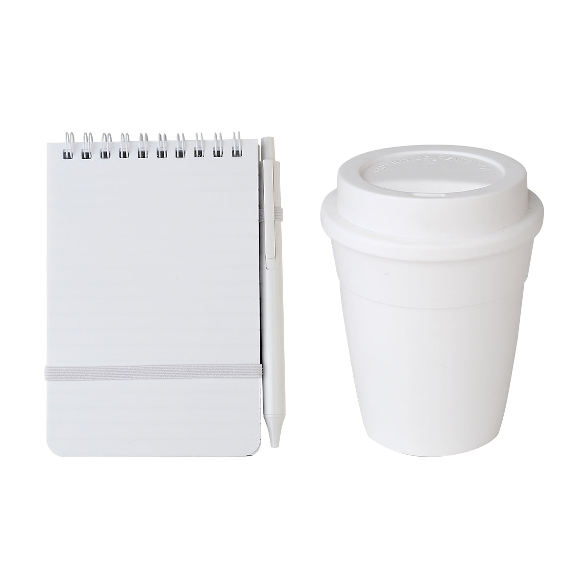 set fabricado en abs con material antibacterial (iones de plata). incluye vaso para café de 350ml, mini libreta para notas y bolígrafo de tinta negra. fabricado en material antibacterial con certificación iso 22196 que inhibe hasta en un 99.9% el crecimiento y multiplicación de bacterias. el aditivo tiene como base los iones de plata, tecnología que que ha sido reconocida y utilizada durante siglos y que no tiene efectos dañinos. incluye caja de cartón individual.