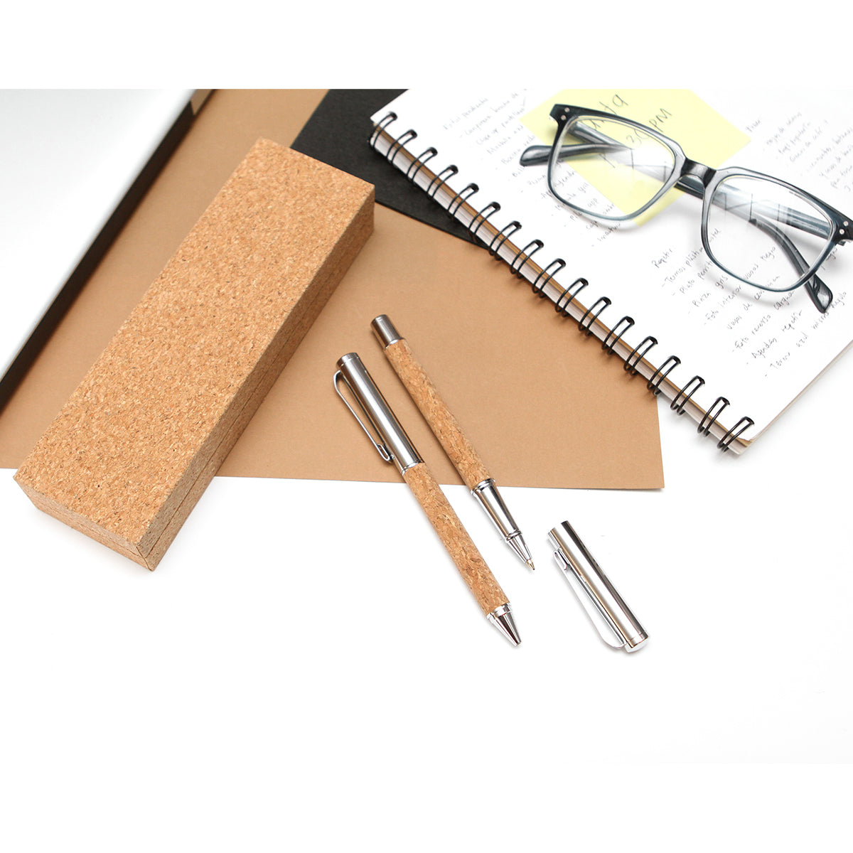 set de roller y ball pen con barril de corcho, clip y punta en metal. incluye estuche fabricado en el mismo material. tinta de escritura negra.