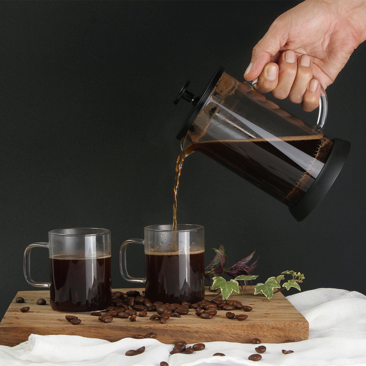 juego de prensa francesa con 2 tazas de cristal, fabricado en vidrio de borosilicato, con tapa de acero inoxidable y plástico, émbolo de acero inoxidable y base de tpr, capacidad de prensa de 600 ml, tazas de 230 ml. incluye caja de cartón por set.