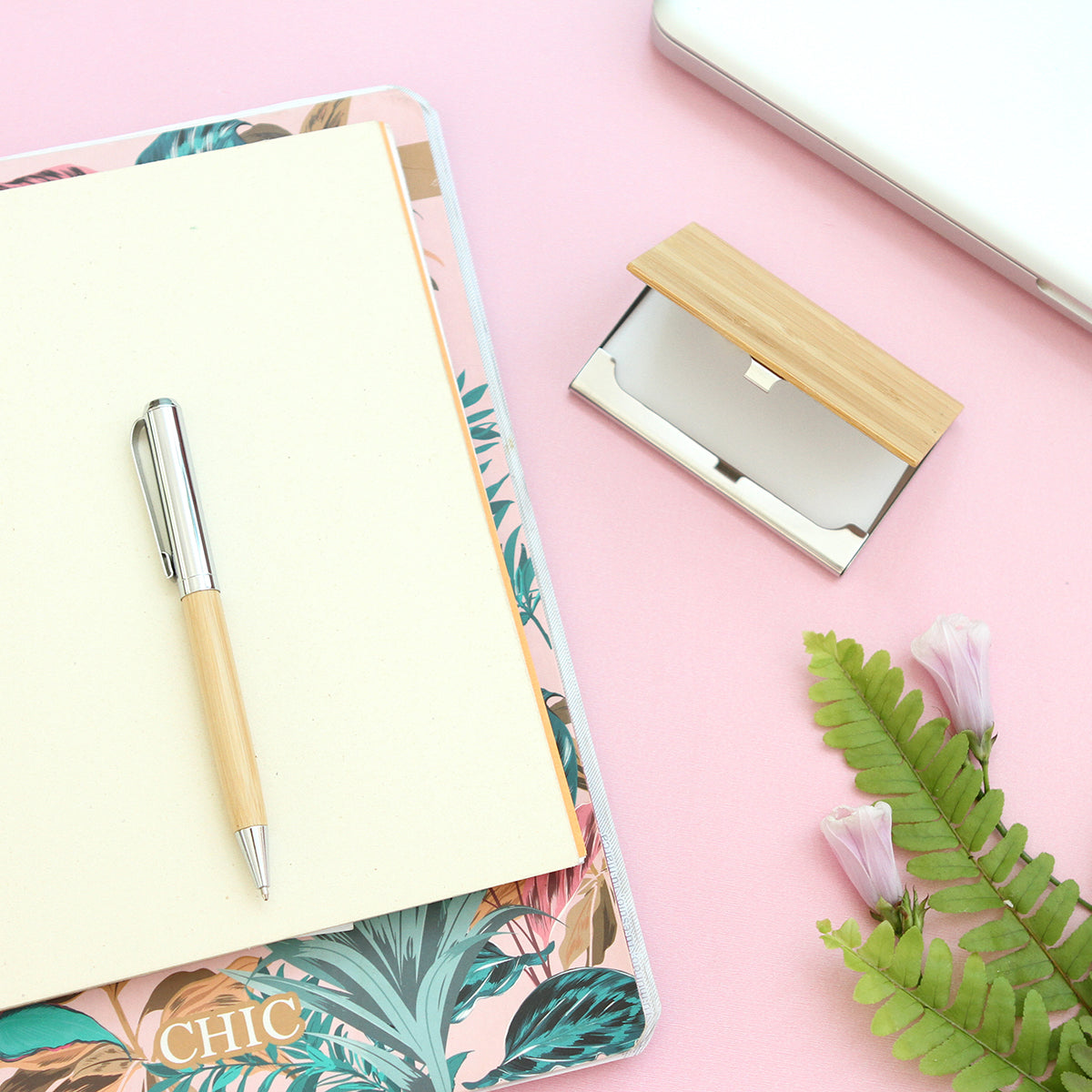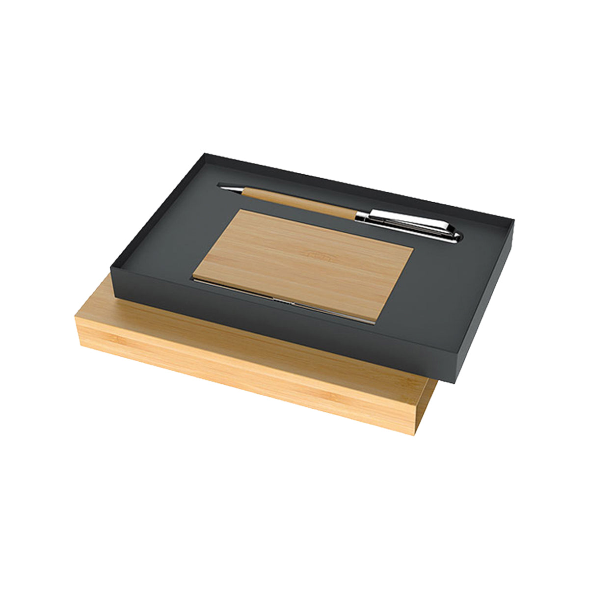 set fabricado en bambú y metal, incluye bolígrafo con barril de bambú y detalles en metal con tinta de escritura negra; tarjetero de bambú con detalles de metal. incluye caja de cartón individual.