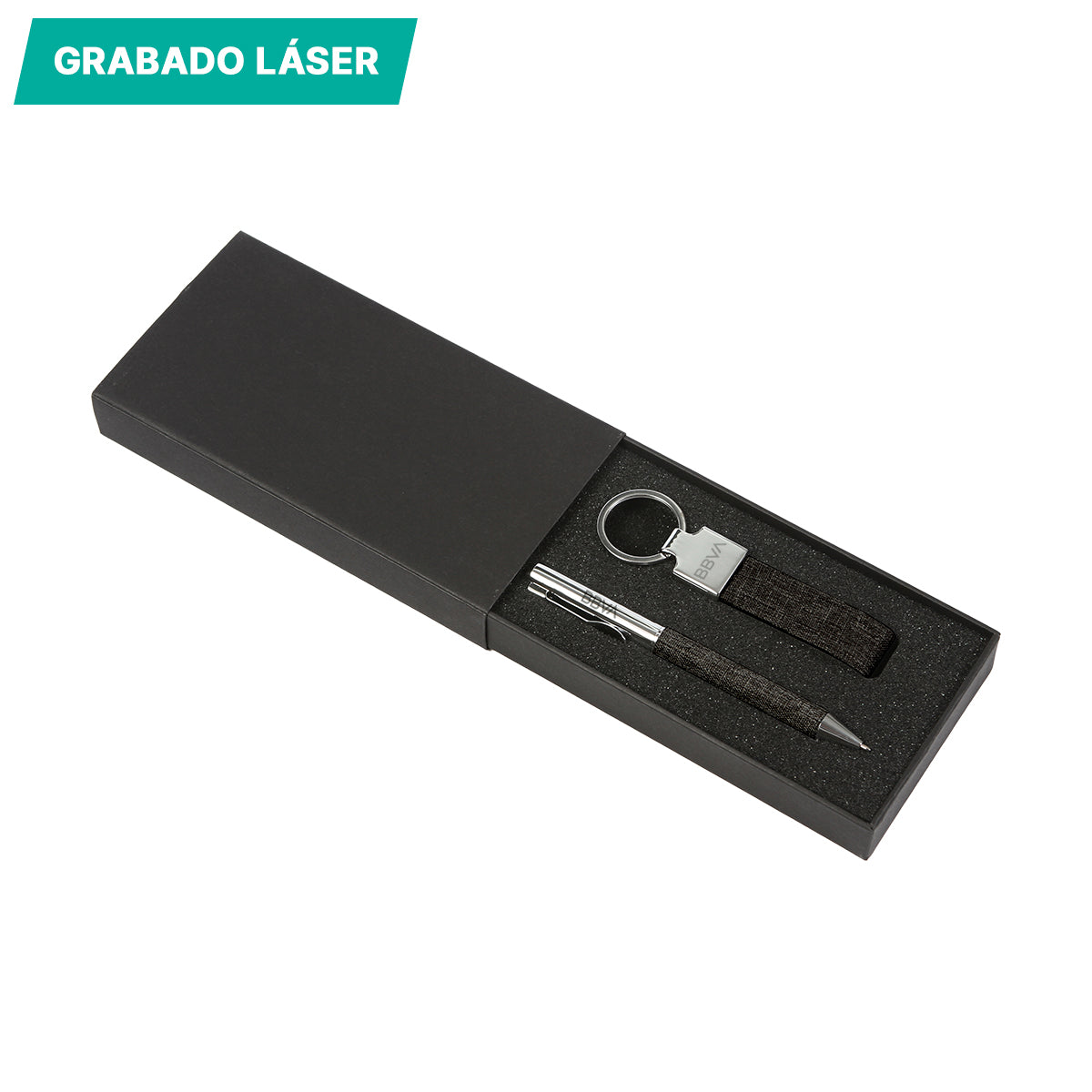 set ejecutivo ecológico fabricado en rpet con llavero, pluma y detalles plateados. incluye estuche. ideal como regalo profesional.los productos fabricados en rpet son sostenibles porque utilizan materiales reciclados en su fabricación, lo que reduce la cantidad de residuos y disminuye el impacto ambiental.